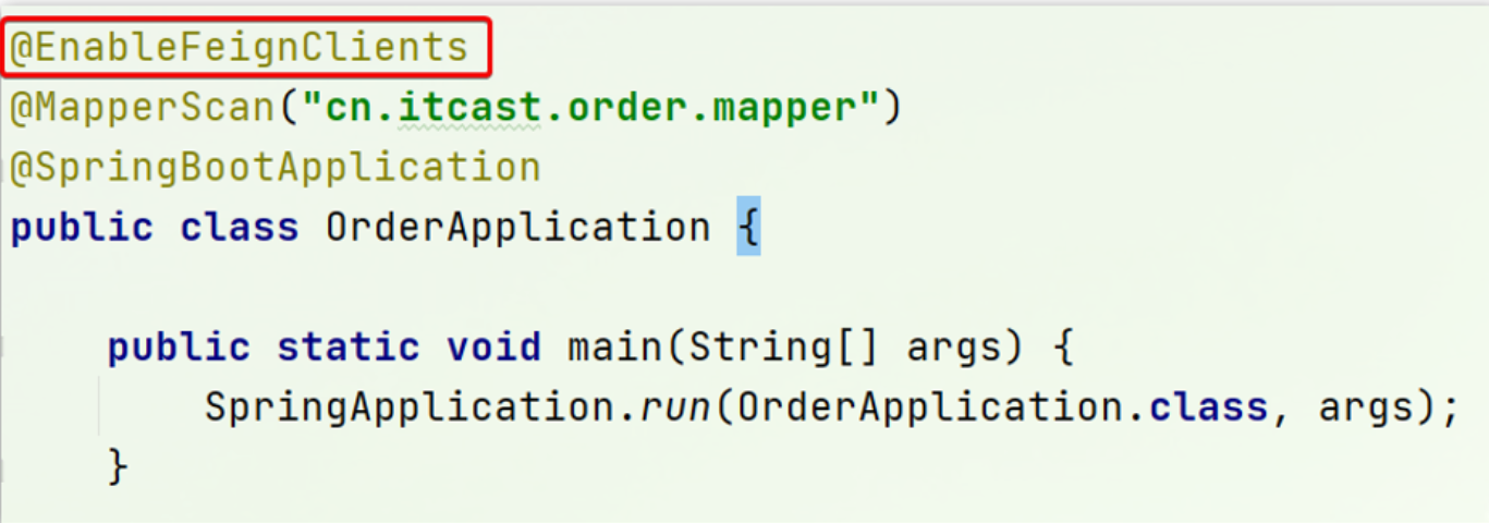 在order-service的启动类添加注解开启Feign的功能: