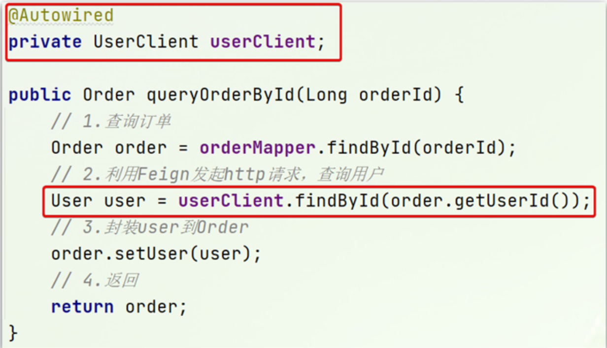 修改order-service中的OrderService类中的queryOrderById方法,使用Feign客户端代替RestTemplate:
