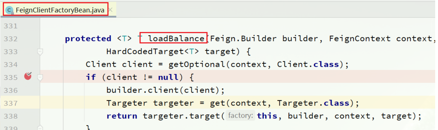 max-connections-per-route: 50 ## 每个路径的最大连接数接下来,在FeignClientFactoryBean中的loadBalance方法中打断点: