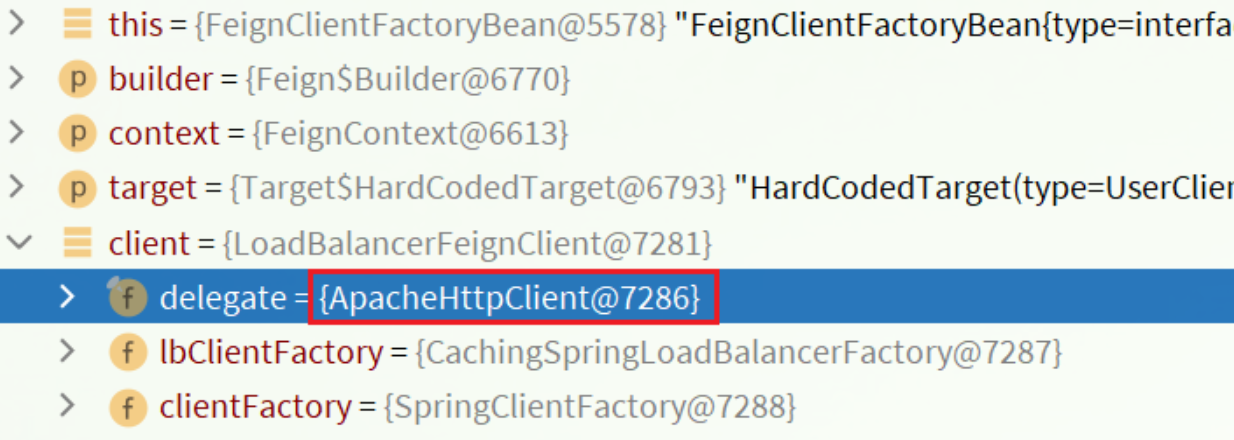 Debug方式启动order-service服务,可以看到这里的client,底层就是Apache HttpClient: