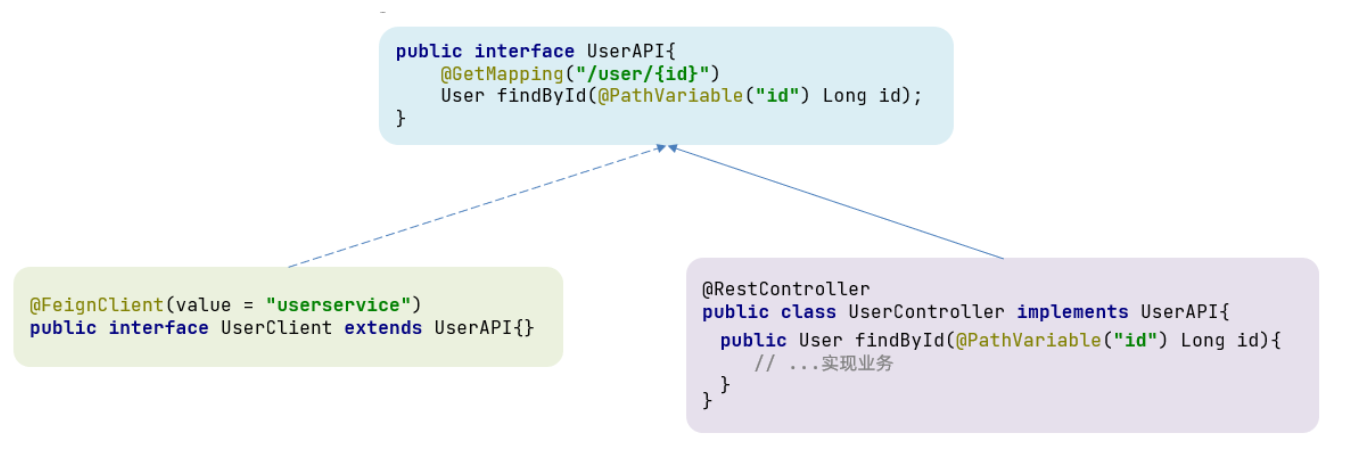 1)定义一个API接口,利用定义方法,并基于SpringMVC注解做声明。 2)Feign客户端和Controller都集成改接口