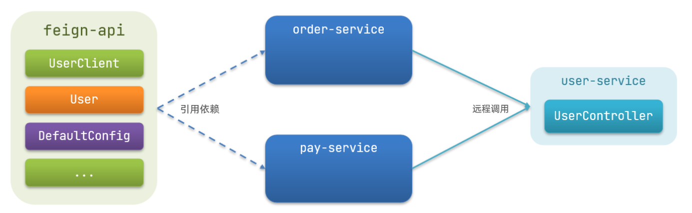 例如,将UserClient、User、Feign的默认配置都抽取到一个feign-api包中,所有微服务引用该依赖包,即可直接使用。