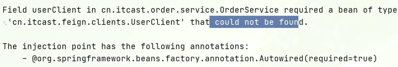 而order-service的@EnableFeignClients注解是在cn.itcast.order包下,不在同一个包,无法扫描到UserClient。
