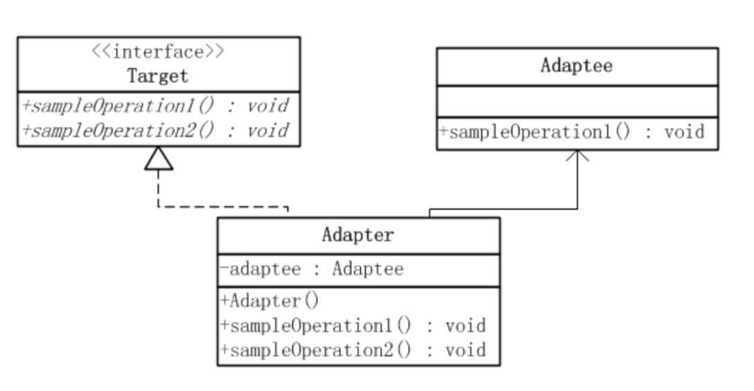 }适配器角色Adapter扩展了Adaptee,同时又实现了目标(Target)接口。由于Adaptee没有提供sampleOperation2()方法,而目标接口又要求这个方法,因此适配器角色Adapter实现了这个方法。