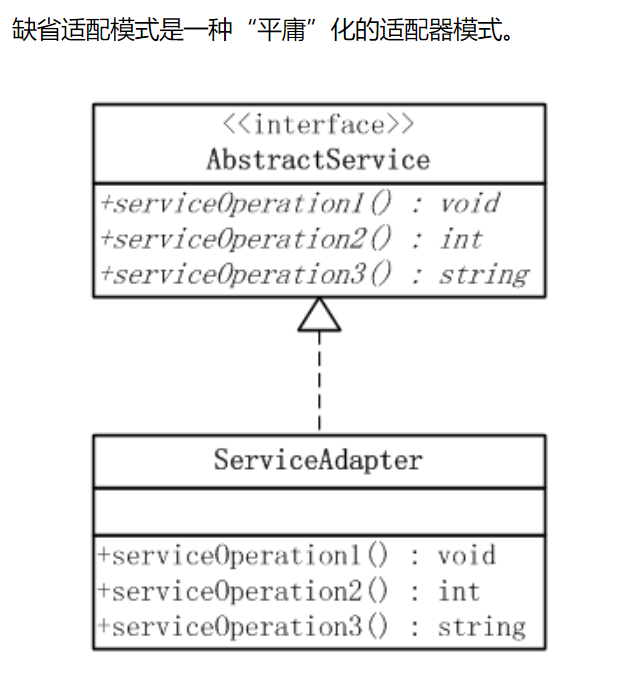 }可以看到,接口AbstractService要求定义三个方法,分别是serviceOperation1()、serviceOperation2()、serviceOperation3();而抽象适配器类ServiceAdapter则为这三种方法都提供了平庸的实现。因此,任何继承自抽象类ServiceAdapter的具体类都可以选择它所需要的方法实现,而不必理会其他的不需要的方法。