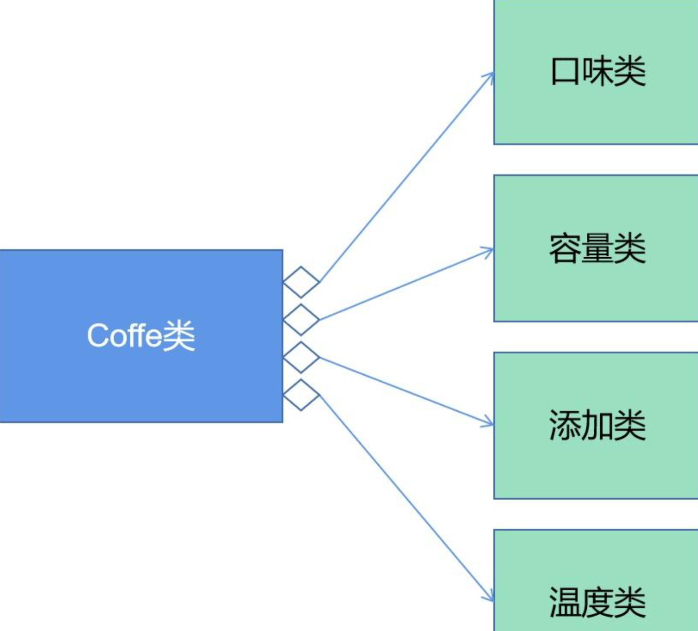 针对第一种方法,我们能不能单独定义每种属性,并让每种属性能够复用,然后将他们组合/聚合起来形成一杯咖啡呢?这样就减少每个属性的重复定义了。 例如: 1. 口味:摩卡、拿铁、美式等分别定义一个类;3个类 2. 容量:大杯、中杯、小杯等分别定义一个类;3个类 3. 添加物:牛奶、糖、蜂蜜等分别定义一个类;3个类 4. 温度:热、常温、冷等分别定义一个类;3个类