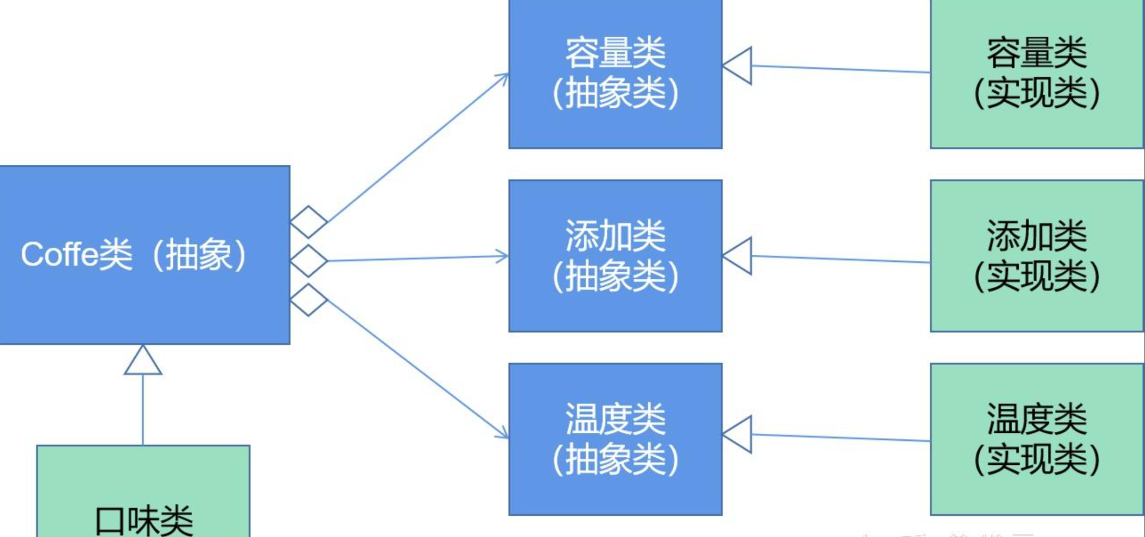 想一下,咖啡的最重要的属性就是口味(也可以说是本质的属性),其它的属性相对来说不是最重要的,那么我们就让口味直接通过继承的方式实现属性的集成,其它三个属性为了提升替换性/重用性,可以也进行一个抽象类的定义,然后去具体实现。