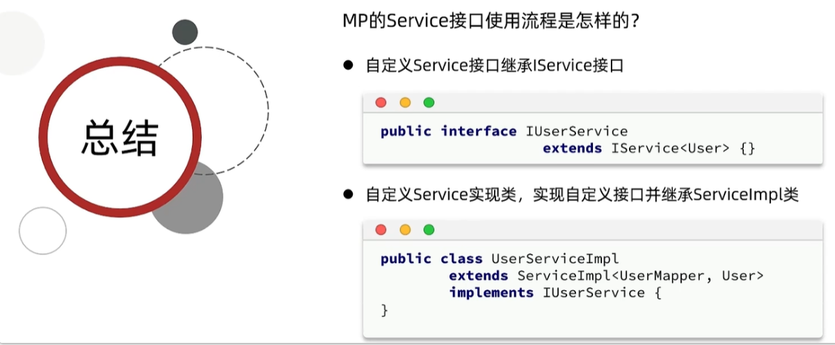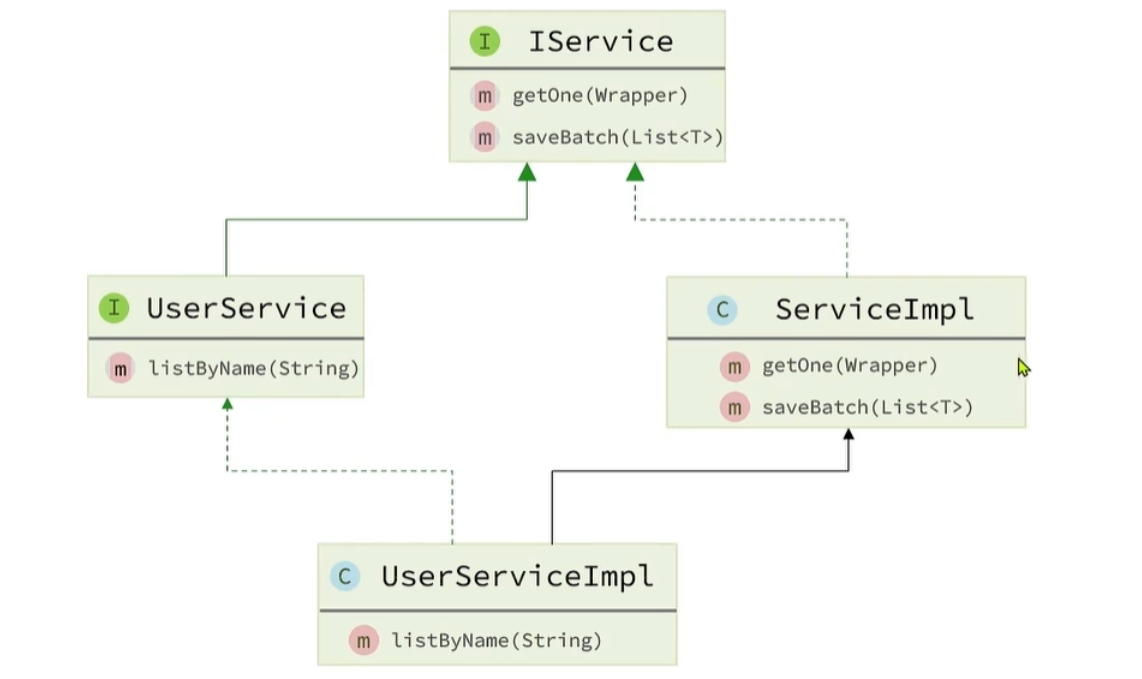 UserMapper继承了MP提供的BaseMapper,dao层的CRUD代码不用写了,很爽。 现在还有一个Service接口,有了它,Service层的代码也不用写了!!!