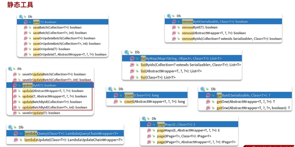 IService里面的方法都是非静态的,DB静态工具都是静态的,没有泛型。所以会多一个参数,就是Class字节码,它得知道是什么类型。需要告诉他实体类类型,其他与IService接口无区别。 但是还是有应用场景的。