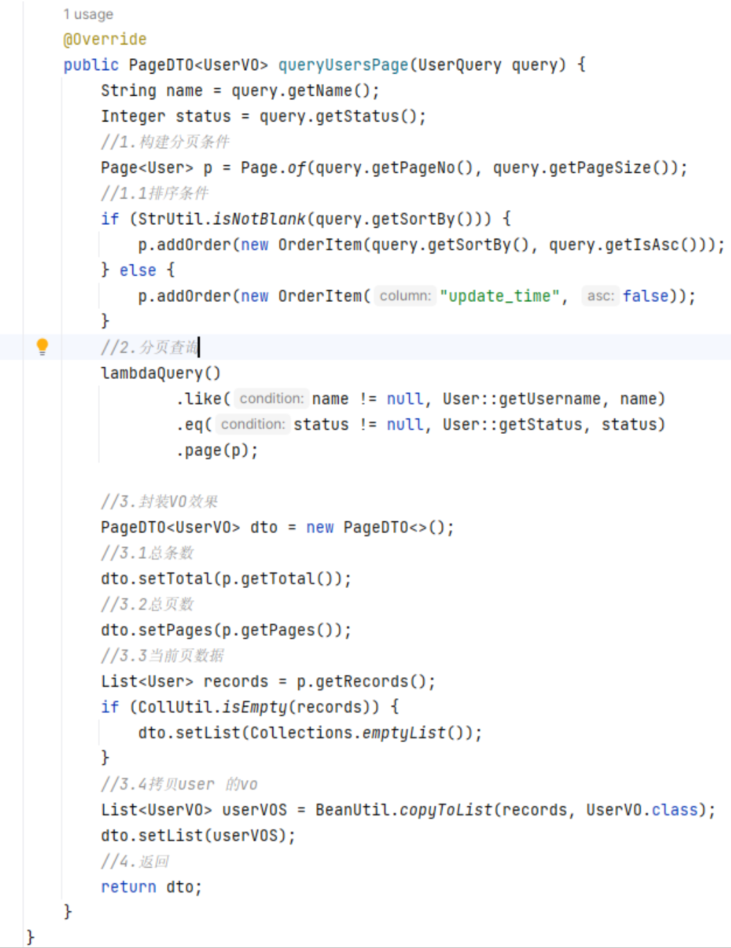 保证了不在业务层编写sql 遵循了开发规范,同时又享受到了MP生成sql条件的便捷的特性。