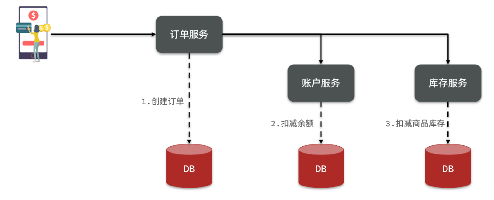 完成上面的操作需要访问三个不同的微服务和三个不同的数据库。