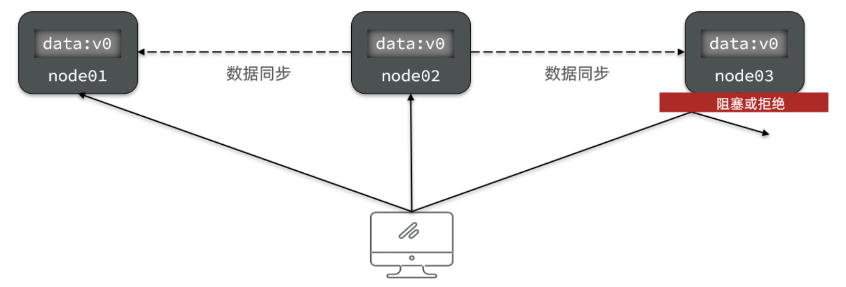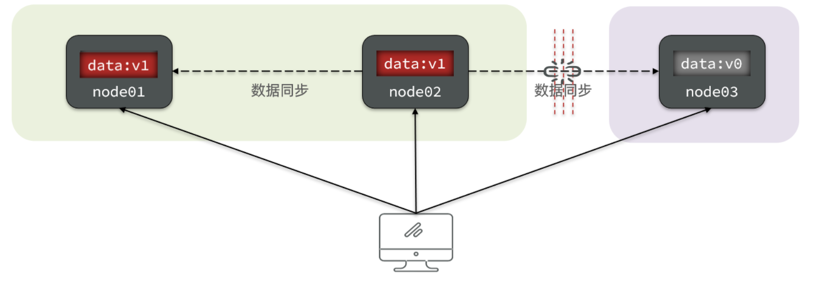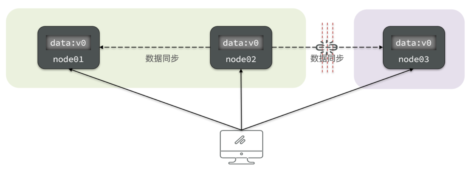 如果此时要保证可用性,就不能等待网络恢复,那node01、node02与node03之间就会出现数据不一致。
