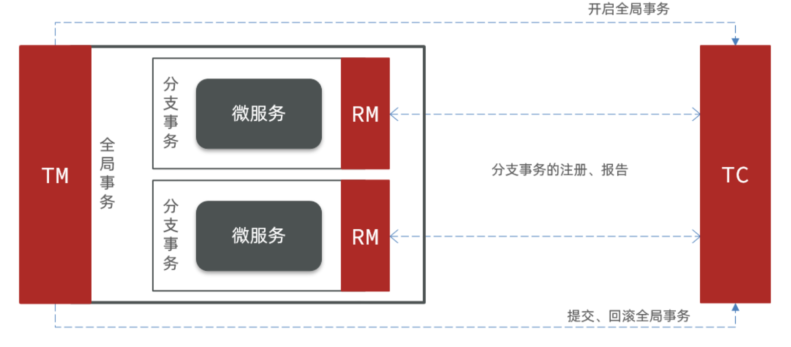 TM (Transaction Manager) - 事务管理器: 定义全局事务的范围、开始全局事务、提交或回滚全局事务。