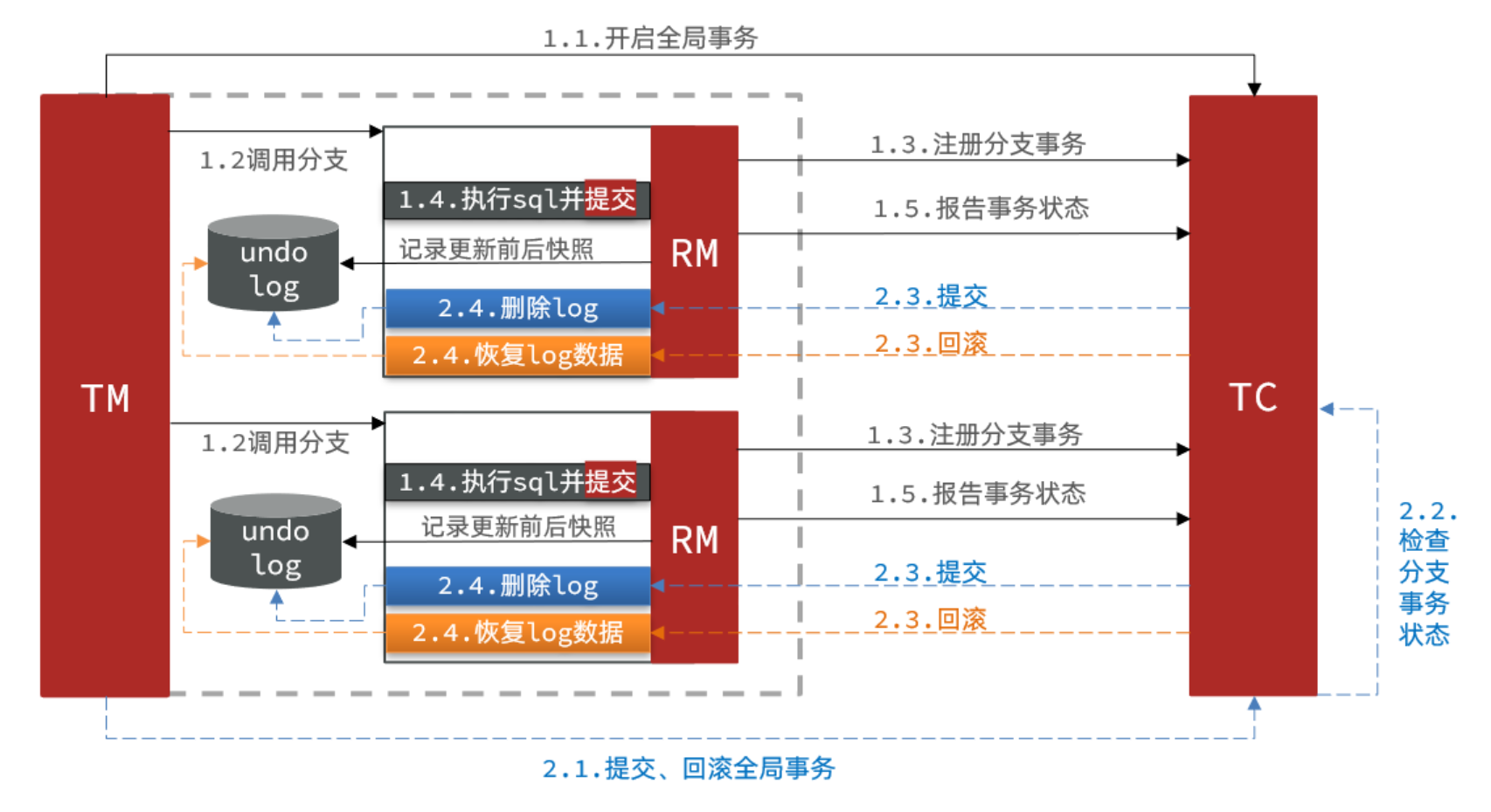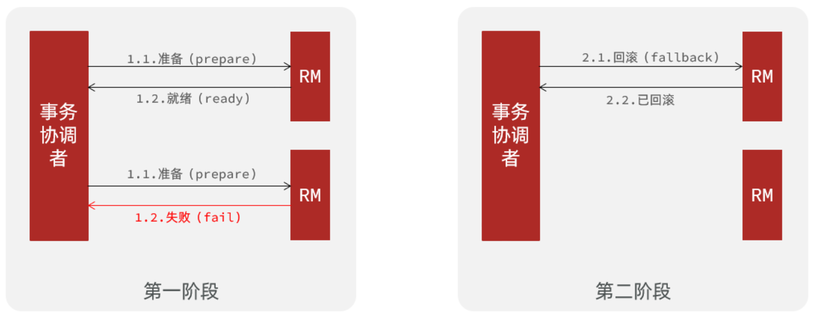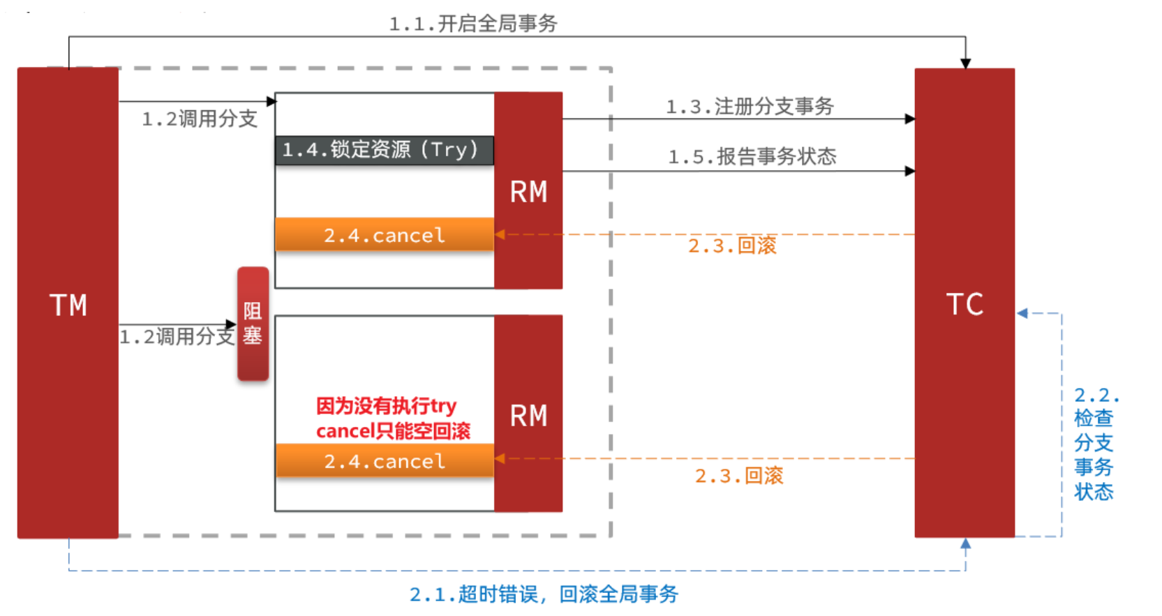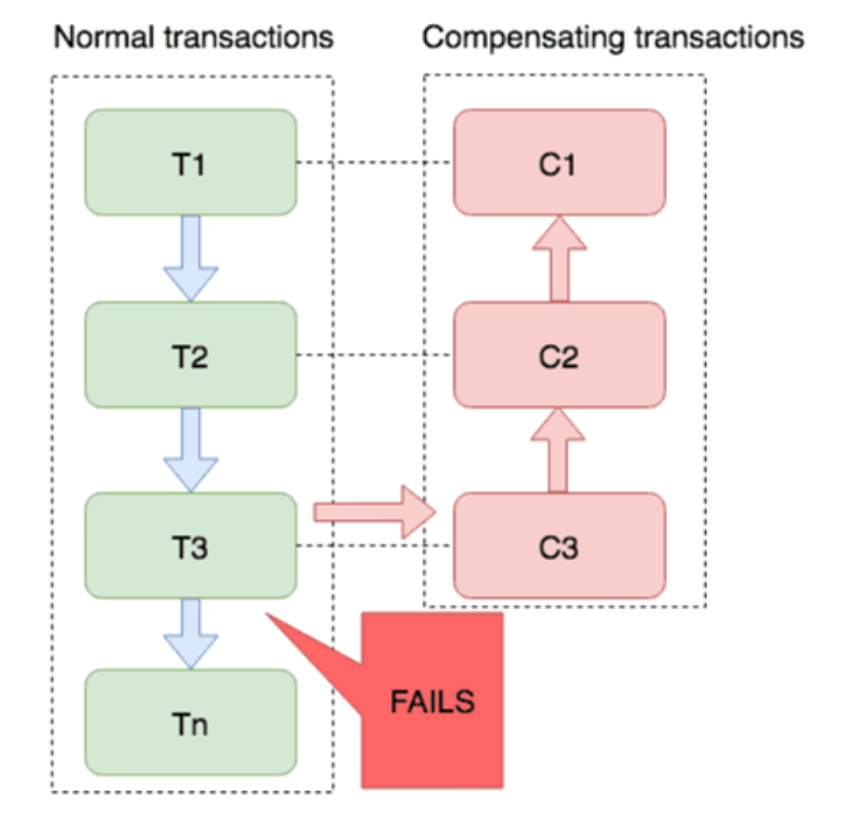分布式事务执行过程中,依次执行各参与者的正向操作,如果所有正向操作均执行成功,那么分布式事务提交。如果任何一个正向操作执行失败,那么分布式事务会去退回去执行前面各参与者的逆向回滚操作,回滚已提交的参与者,使分布式事务回到初始状态。