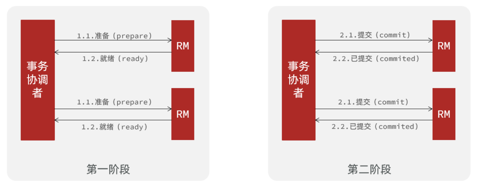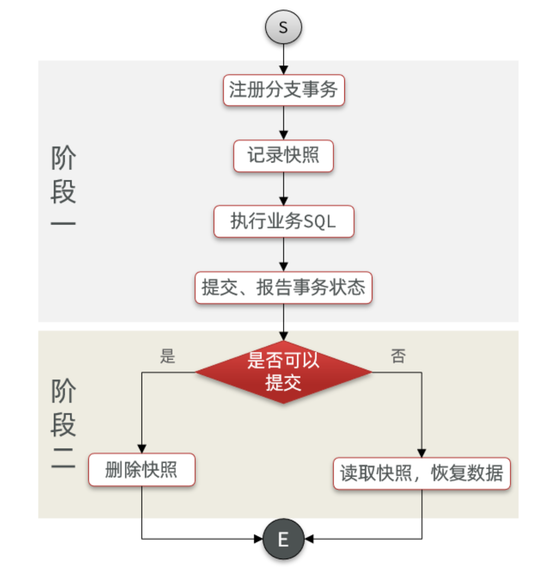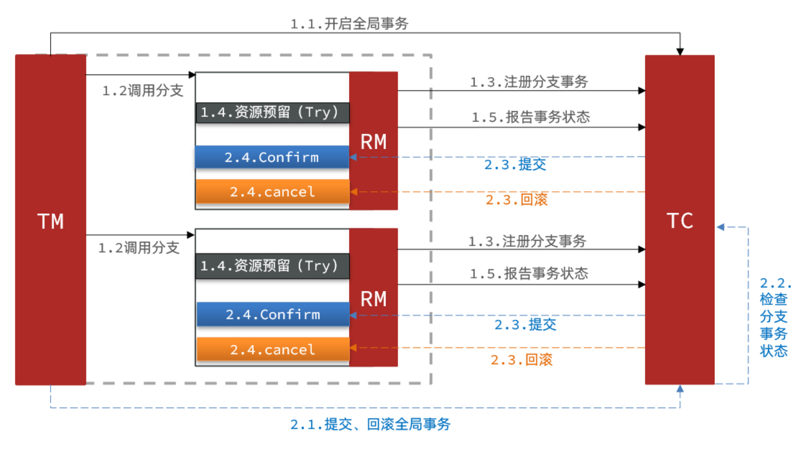 分布式事务执行过程中,依次执行各参与者的正向操作,如果所有正向操作均执行成功,那么分布式事务提交。如果任何一个正向操作执行失败,那么分布式事务会去退回去执行前面各参与者的逆向回滚操作,回滚已提交的参与者,使分布式事务回到初始状态。