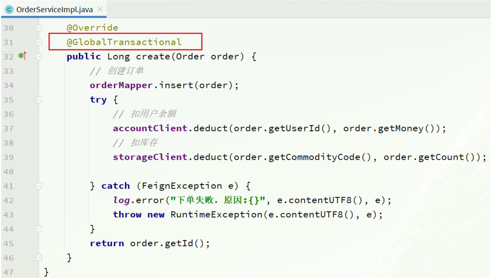订单的创建、库存的扣减、账户扣款在每一个服务和数据库内是一个本地事务,可以保证ACID原则。