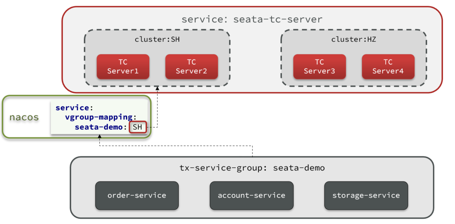 微服务基于事务组(tx-service-group)与TC集群的映射关系,来查找当前应该使用哪个TC集群。当SH集群故障时,只需要将vgroup-mapping中的映射关系改成HZ。则所有微服务就会切换到HZ的TC集群了。