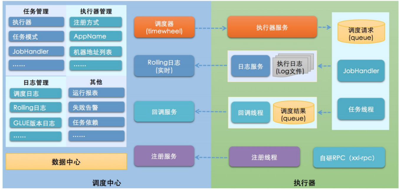 - 调度中心:负责管理调度信息,按照调度配置发出调度请求,自身不承担业务代码。调度系统和任务解耦,提高了系统可用性和稳定性。通调度性能不在受限于任务模块。