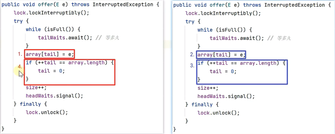 headWaits.signal();// offer_1 让offer_1唤醒一次,offer_2和3不做唤醒操作,让poll自己内部唤醒,减少锁的使用
