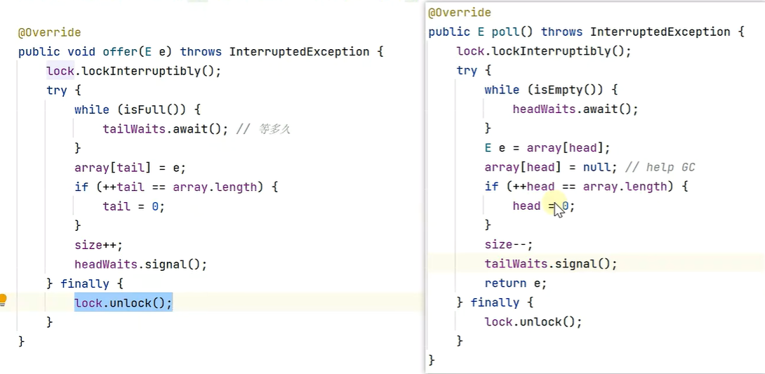 offer和poll线程是互相影响的,offer在加锁状态下,poll加不上锁会处于阻塞状态,得等offer执行完了解锁,poll才能获得锁。读写不能同时进行!这样是不合理的。一个操作头,一个操作尾,按理来讲应该互不干扰。所以可以用双锁来实现。