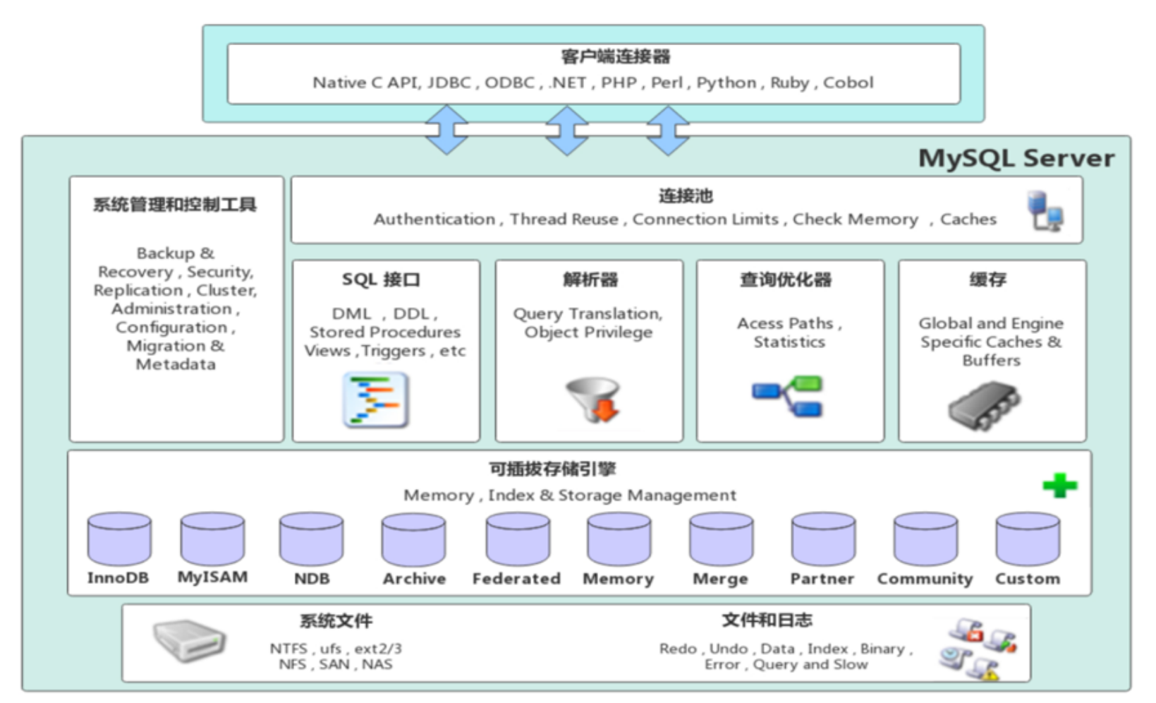 数据存储层, 主要是将数据(如: redolog、undolog、数据、索引、二进制日志、错误日志、查询 日志、慢查询日志等)存储在文件系统之上,并完成与存储引擎的交互
