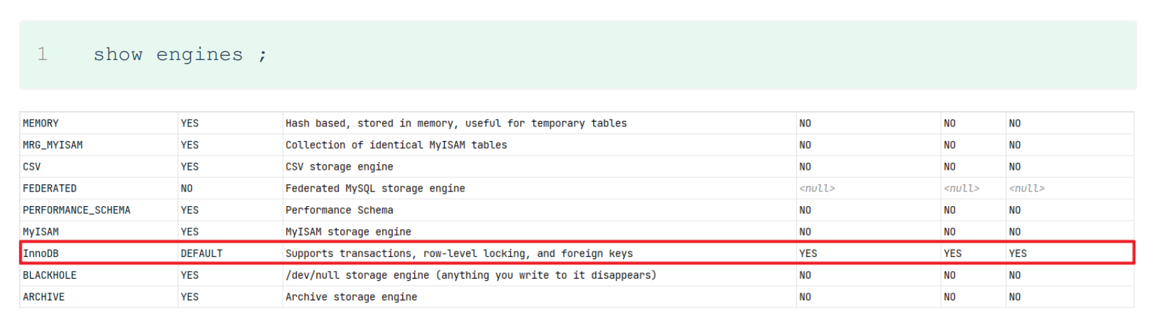 ) ENGINE = INNODB [ COMMENT 表注释 ] ;查询当前数据库支持的存储引擎