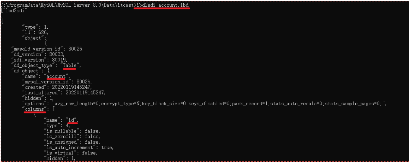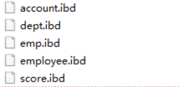 可以看到里面有很多的ibd文件,每一个ibd文件就对应一张表,比如:我们有一张表account,就 有这样的一个account.ibd文件,而在这个ibd文件中不仅存放表结构、数据,还会存放该表对应的 索引信息。而该文件是基于二进制存储的,不能直接基于记事本打开,我们可以使用mysql提供的一 个指令ibd2sdi ,通过该指令就可以从ibd文件中提取sdi信息,而sdi数据字典信息中就包含该表的表结构。