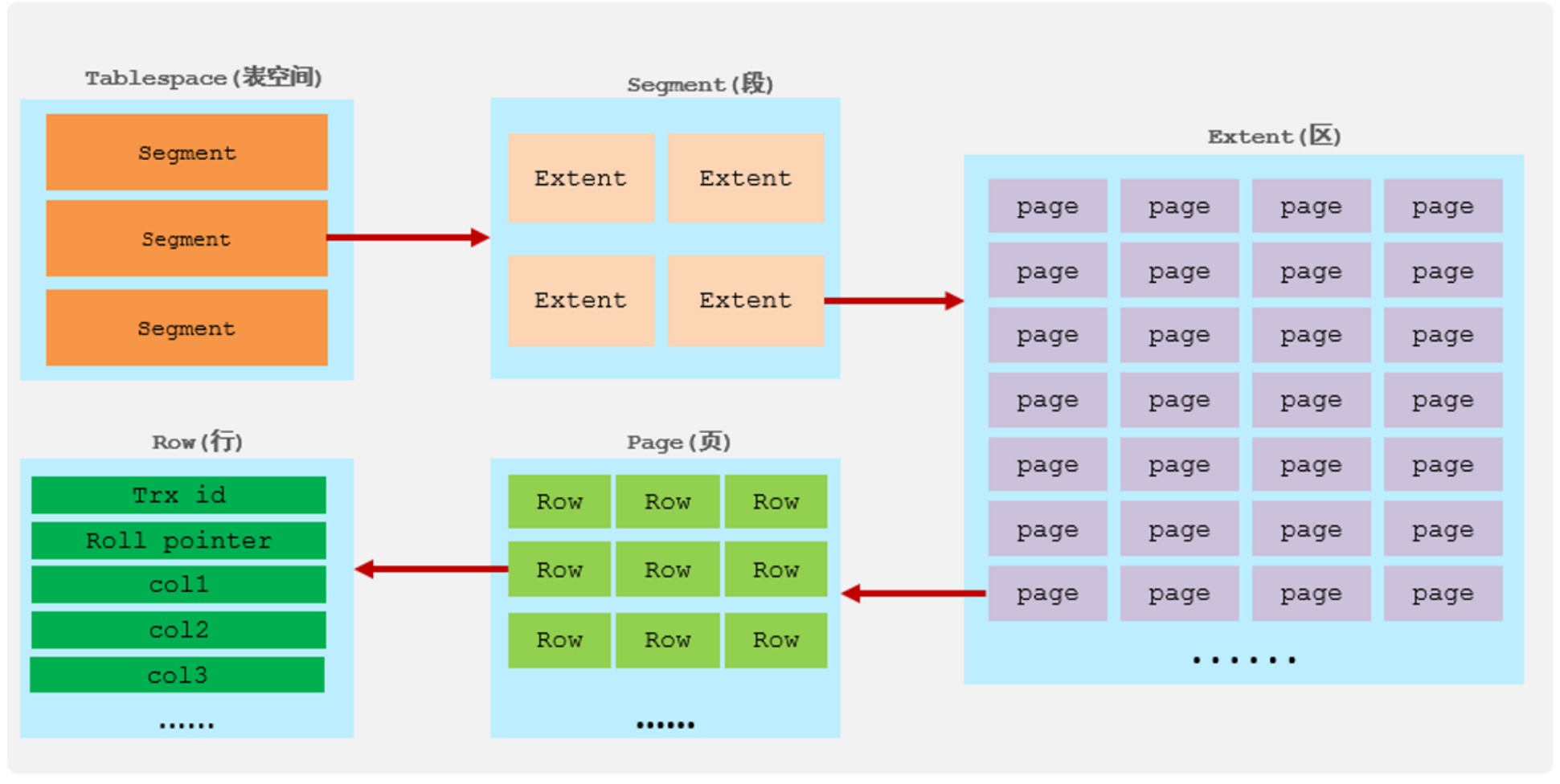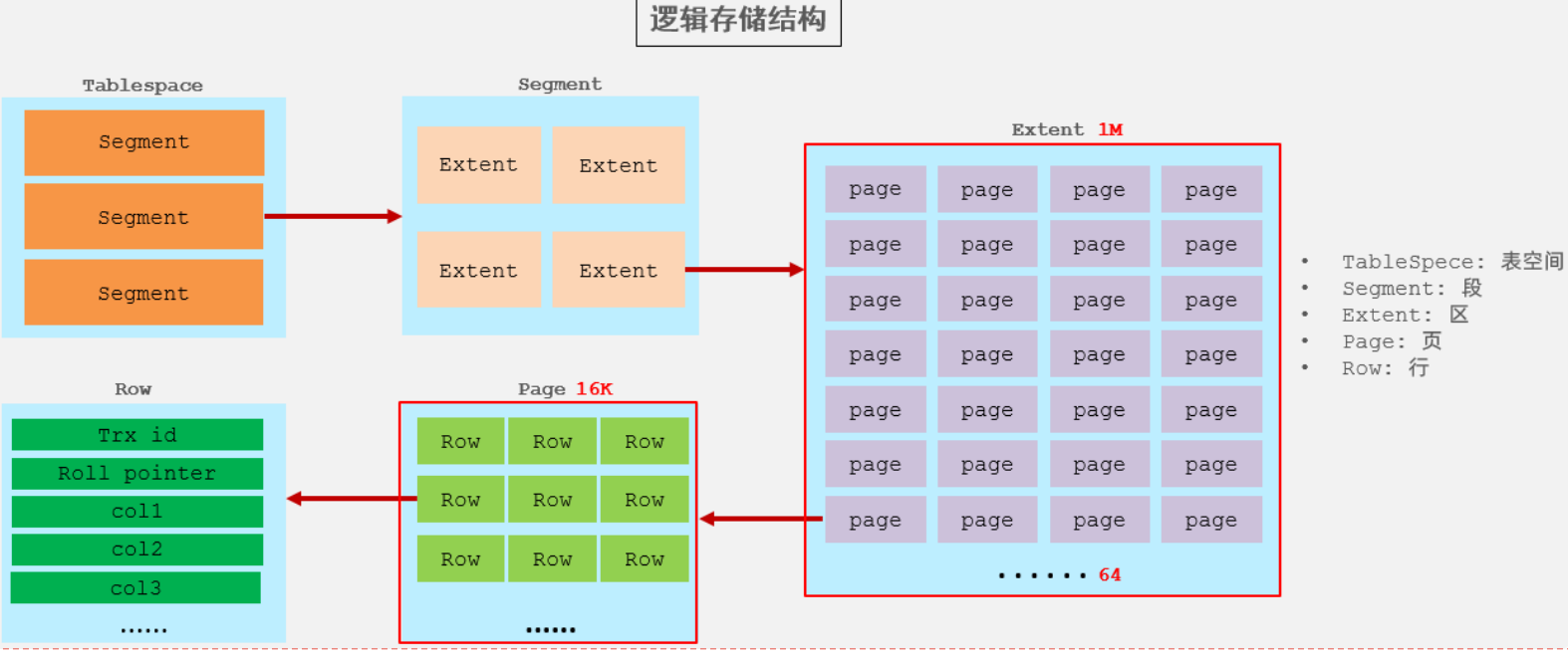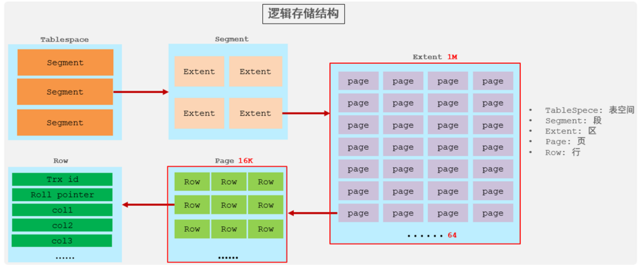 段 : 表空间是由各个段组成的,常见的段有数据段、索引段、回滚段等。InnoDB中对于段的管理,都是引擎自身完成,不需要人为对其控制,一个段中包含多个区。