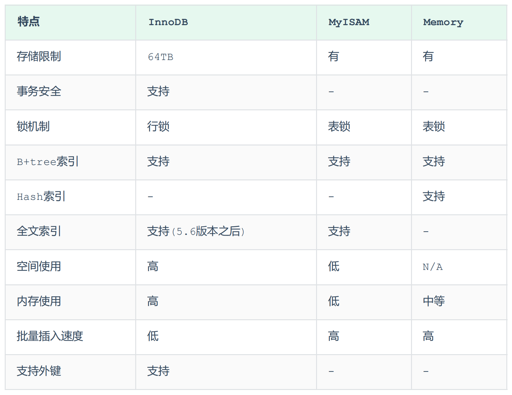 了解了如何在建表时如何指定存储引擎,接下来介绍下来上面重点提到的三种存储引擎 InnoDB、MyISAM、Memory的特点。