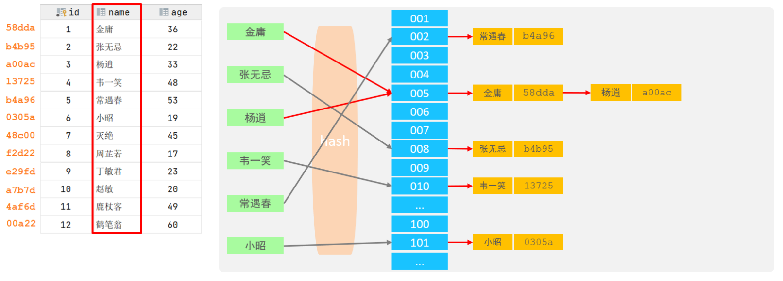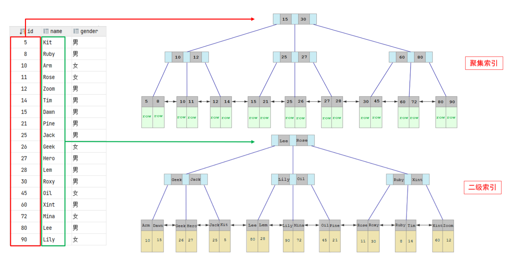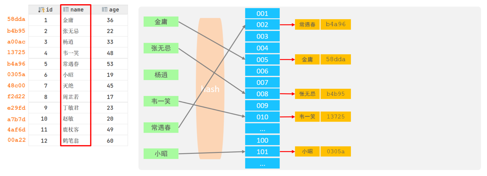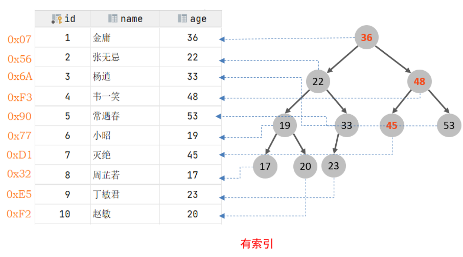 如果我们针对于这张表建立了索引,假设索引结构就是二叉树,那么也就意味着,会对age这个字段建立一个二叉树的索引结构。