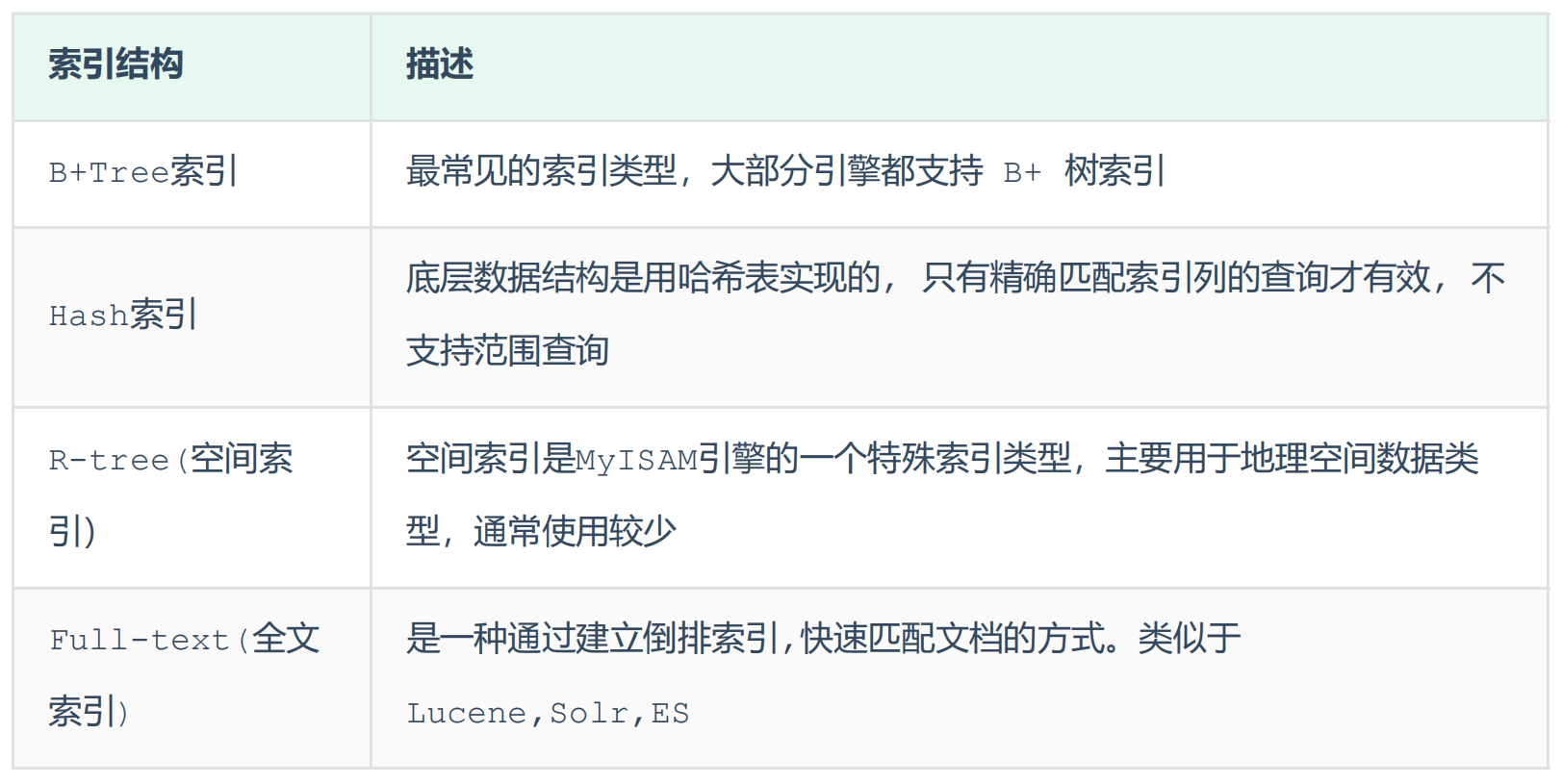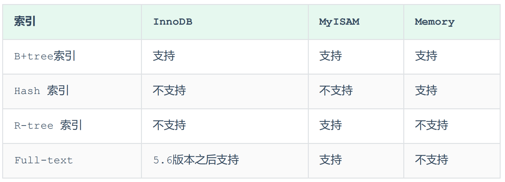 上述是MySQL中所支持的所有的索引结构,接下来,我们再来看看不同的存储引擎对于索引结构的支持情况。