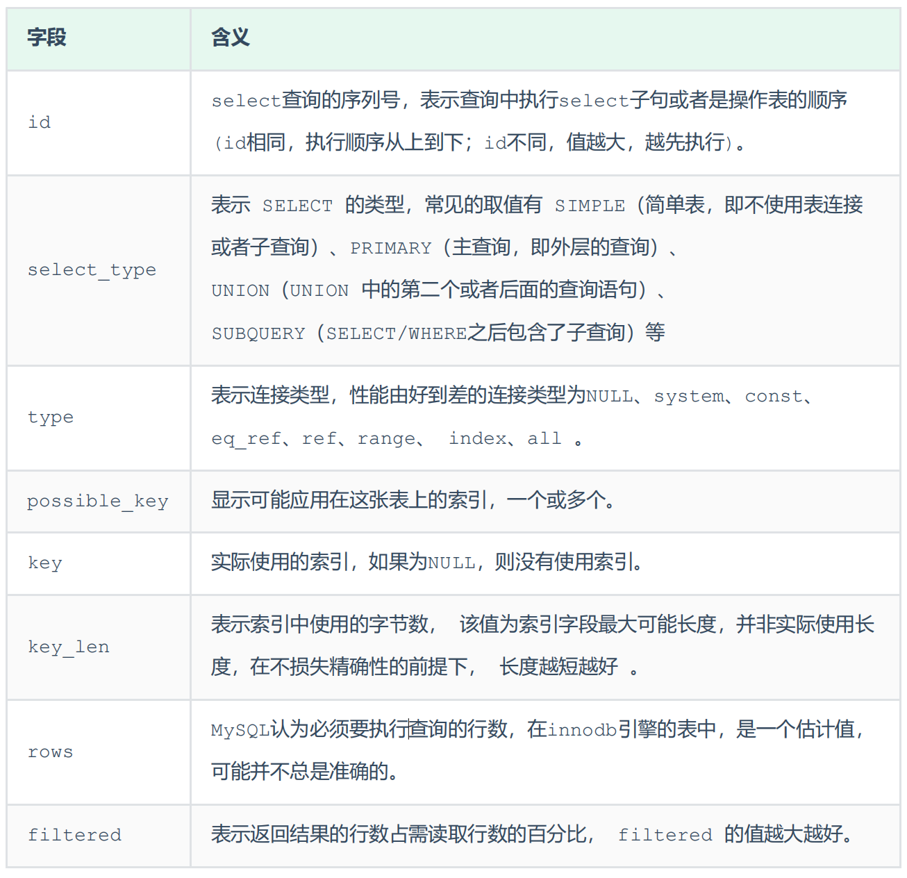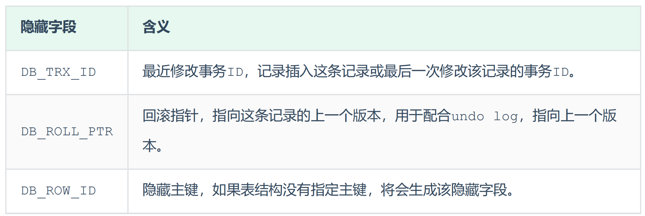 当创建了上面的这张表,我们在查看表结构的时候,就可以显式的看到这三个字段。 实际上除了这三个字段以外,InnoDB还会自动的给我们添加三个隐藏字段及其含义分别是:
