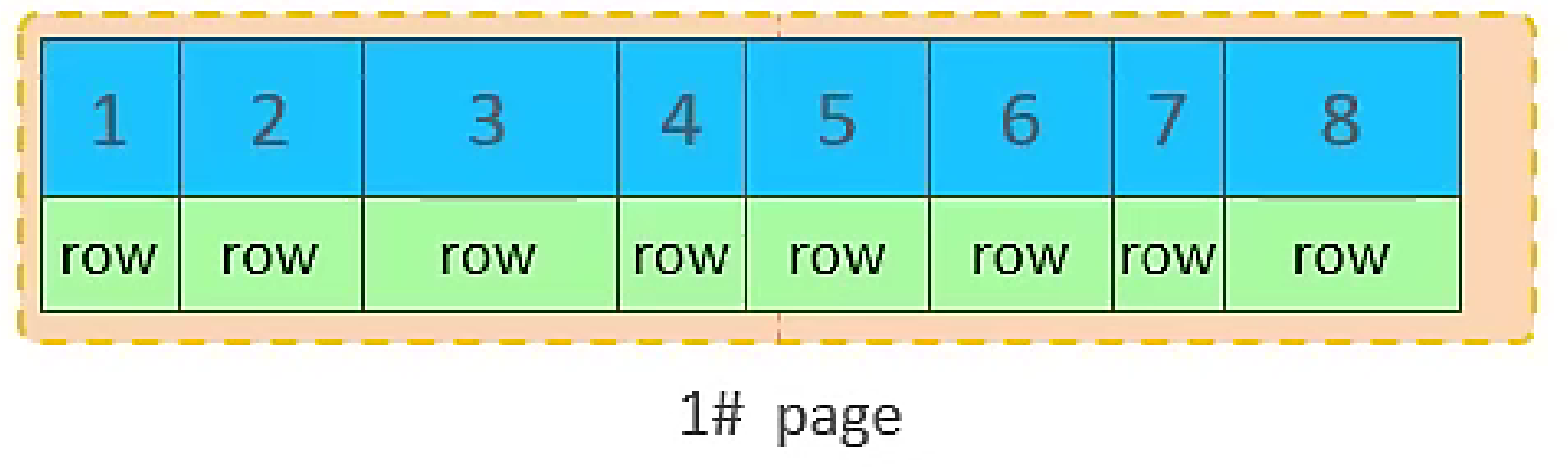 行 : InnoDB 存储引擎是面向行的,也就是说数据是按行进行存放的,在每一行中除了定义表时所指定的字段以外,还包含两个隐藏字段(后面会详细介绍)。