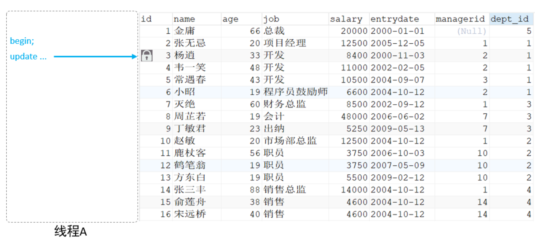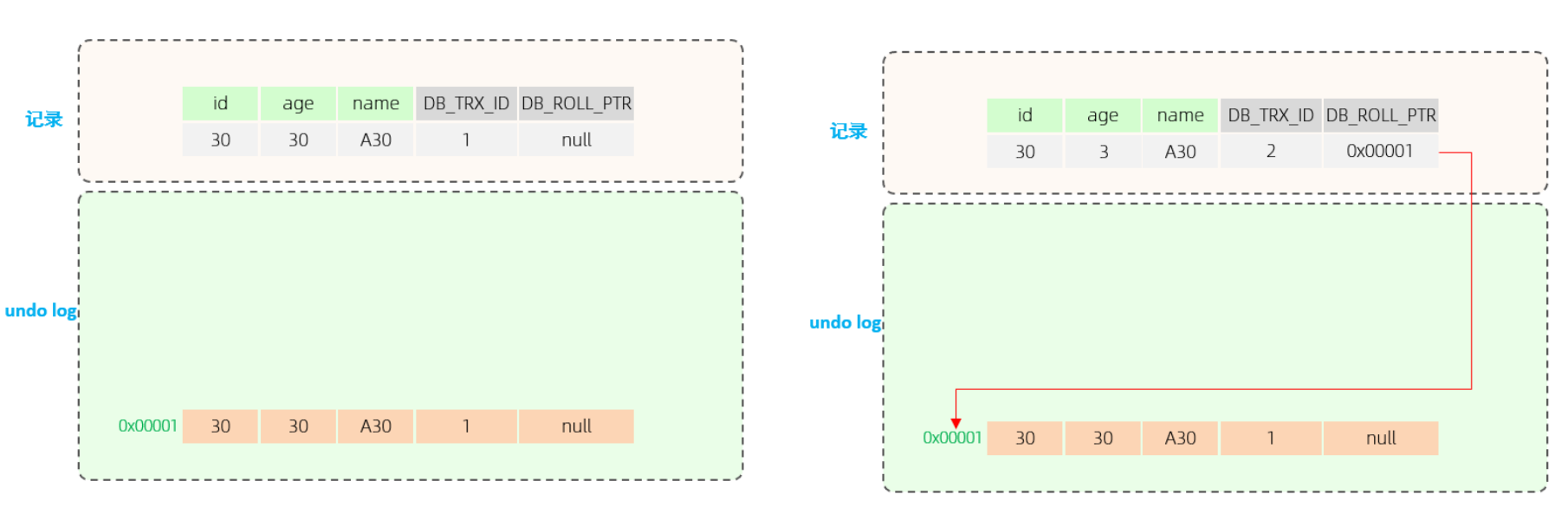 当事务2执行第一条修改语句时,会记录undo log日志,记录数据变更之前的样子; 然后更新记录,并且记录本次操作的事务ID,回滚指针,回滚指针用来指定如果发生回滚,回滚到哪一个版本。
