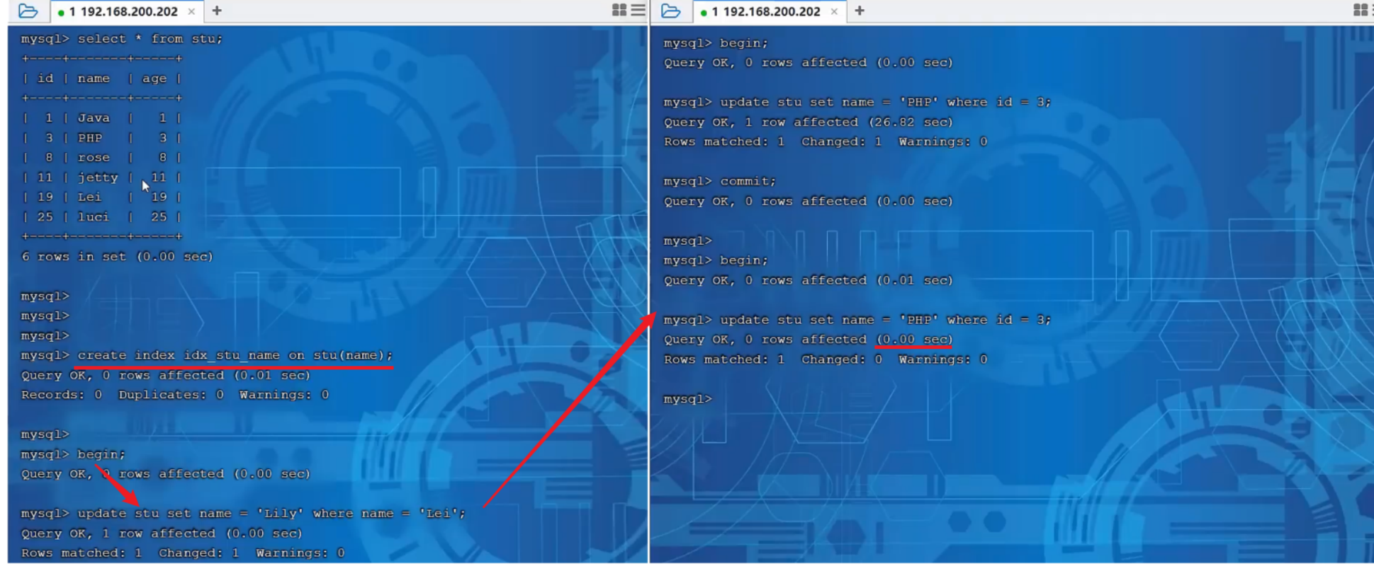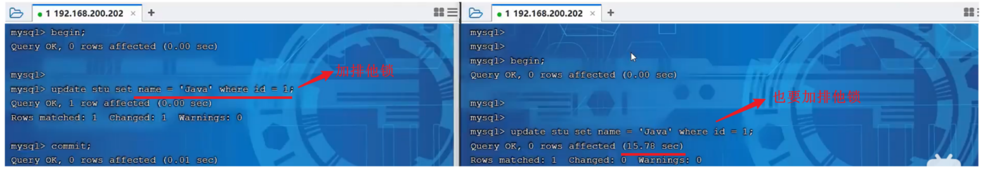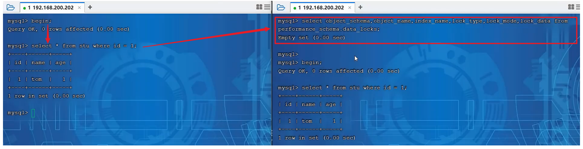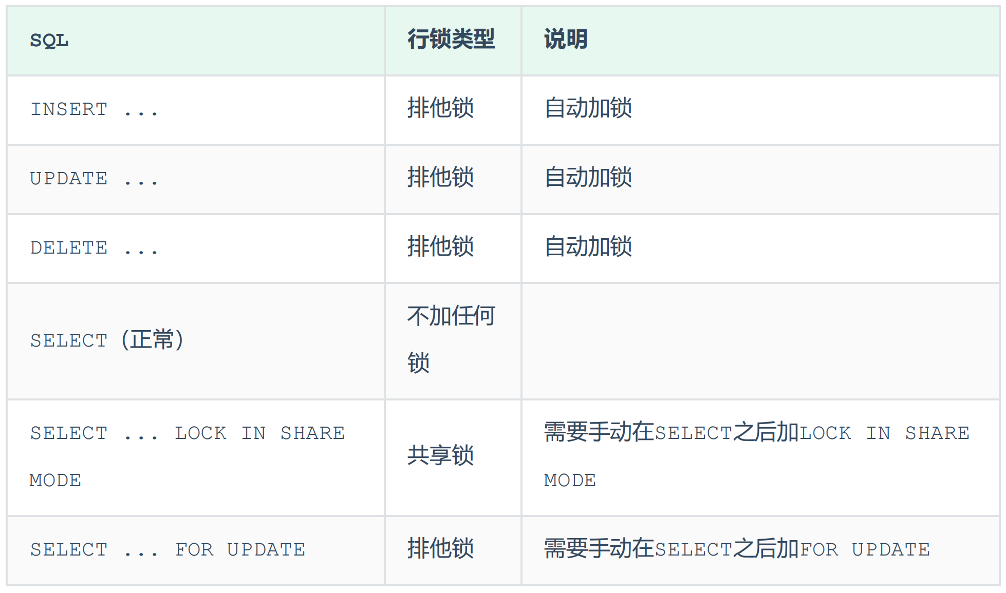 在测试中我们可以看到,即使是在默认的RR隔离级别下,事务A中依然可以读取到事务B最新提交的内容,因为在查询语句后面加上了 lock in share mode 共享锁,此时是当前读操作。当然,当我们加排他锁的时候,也是当前读操作。