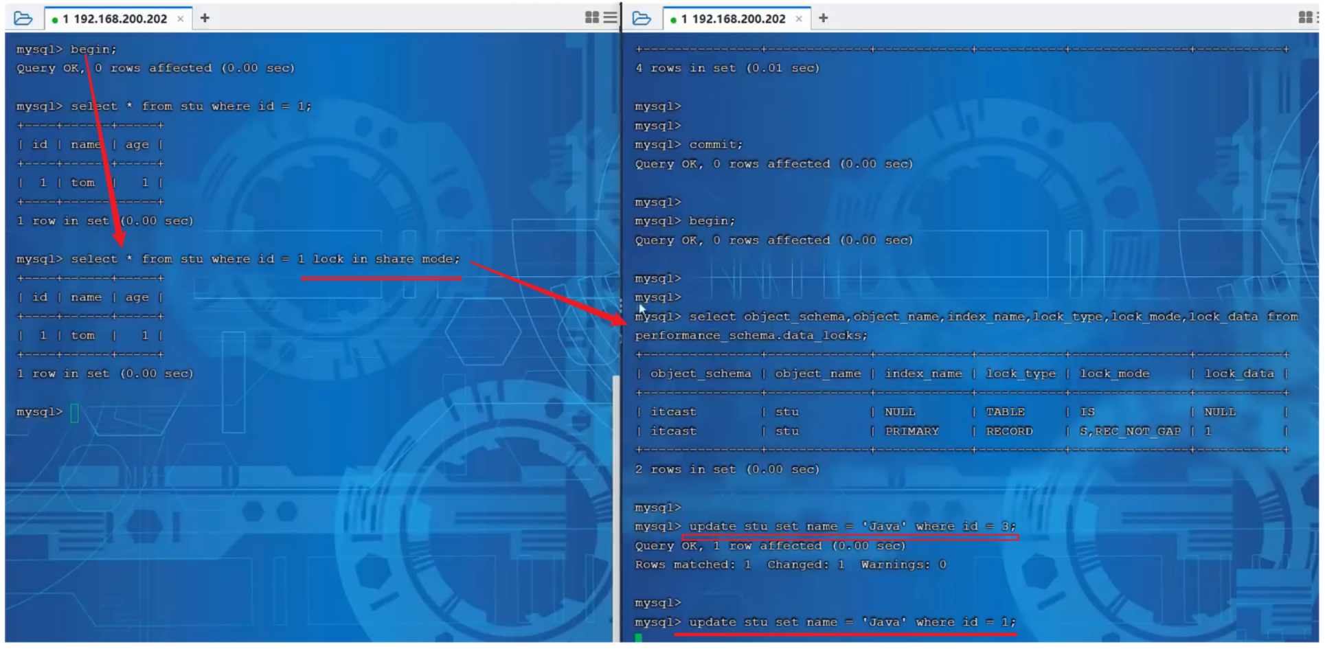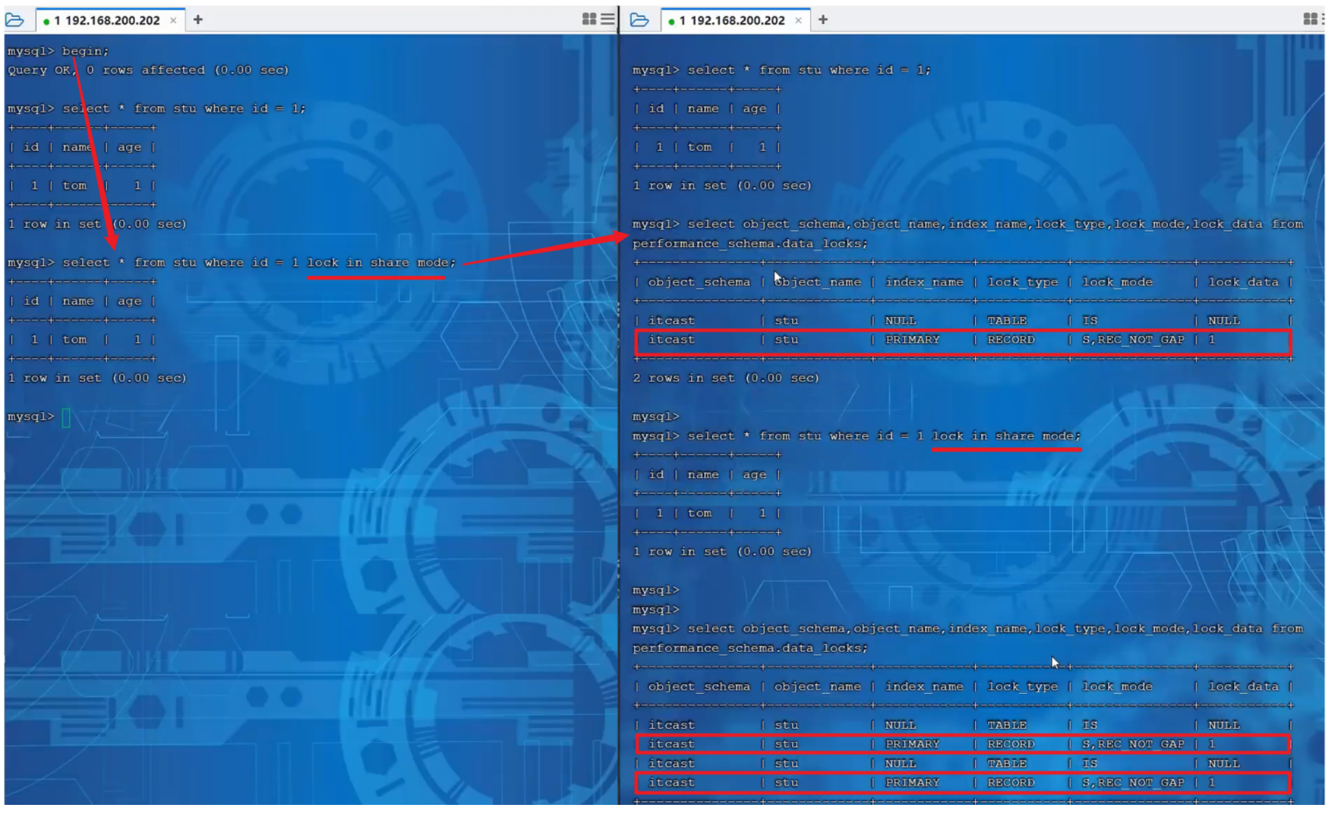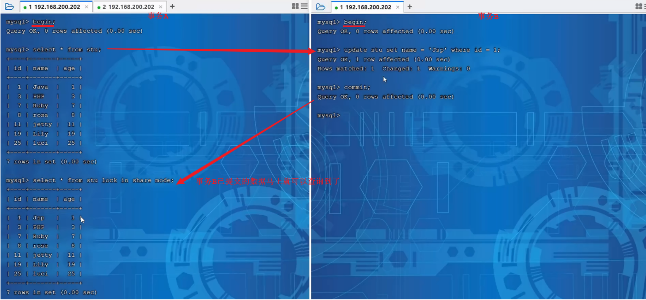 读取的是记录的最新版本,读取时还要保证其他并发事务不能修改当前记录,会对读取的记录进行加锁。对于我们日常的操作,如:select ... lock in share mode(共享锁),select ... for update、update、insert、delete(排他锁)都是一种当前读。