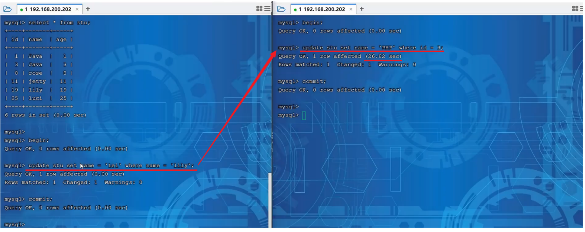 当事务4执行第一条修改语句时,也会记录undo log日志,记录数据变更之前的样子; 然后更新记 录,并且记录本次操作的事务ID,回滚指针,回滚指针用来指定如果发生回滚,回滚到哪一个版本。