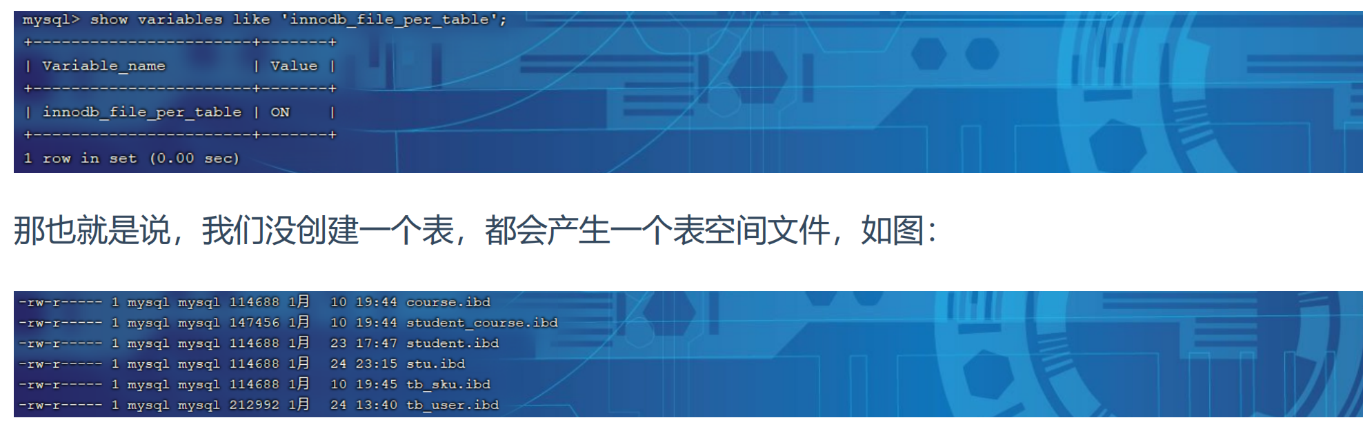xxx.ibd:xxx代表的是表名,innoDB引擎的每张表都会对应这样一个表空间文件,存储该表的表结 构(frm-早期的、sdi-新版的)、数据和索引。 参数:innodb_file_per_table
