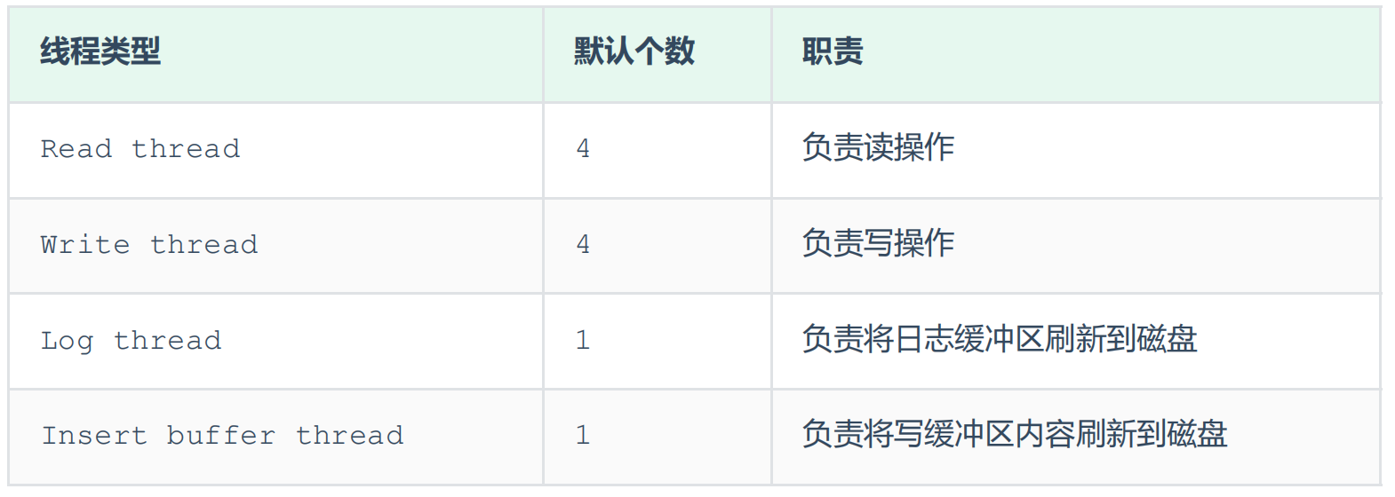 在InnoDB存储引擎中大量使用了AIO来处理IO请求, 这样可以极大地提高数据库的性能,而IO Thread主要负责这些IO请求的回调。