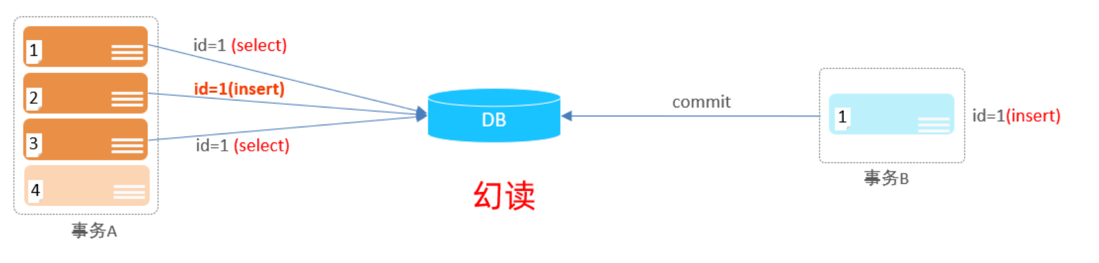 3). 幻读:一个事务按照条件查询数据时,没有对应的数据行,但是在插入数据时,又发现这行数据已经存在,好像出现了 "幻影"。