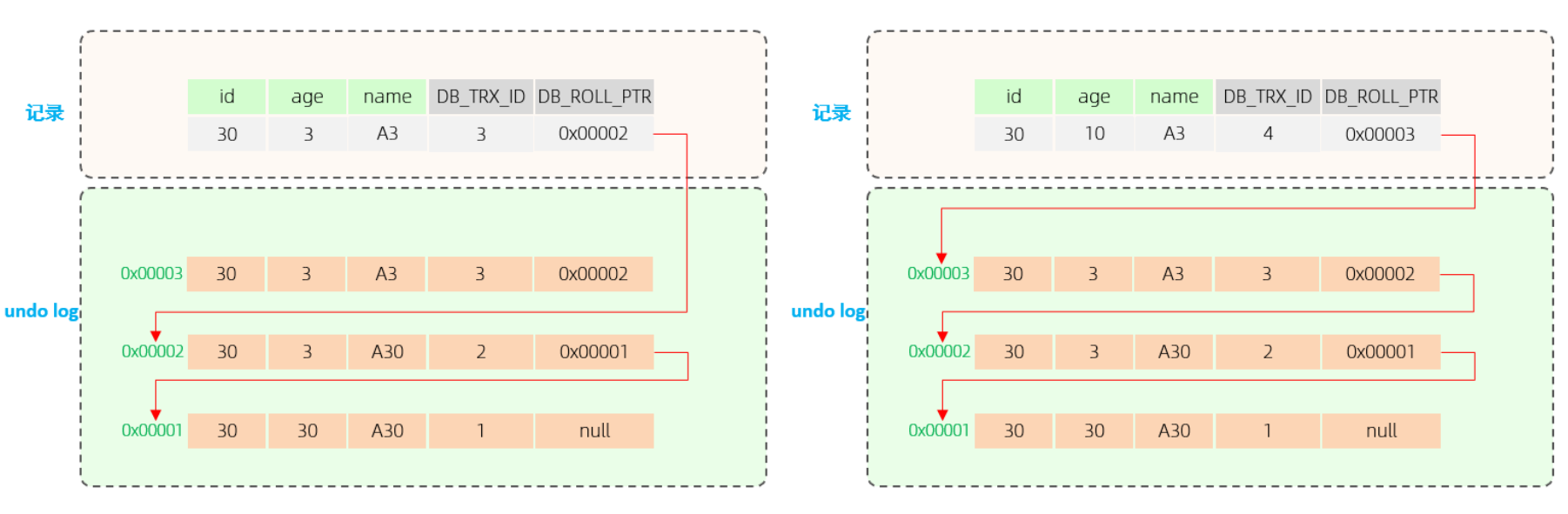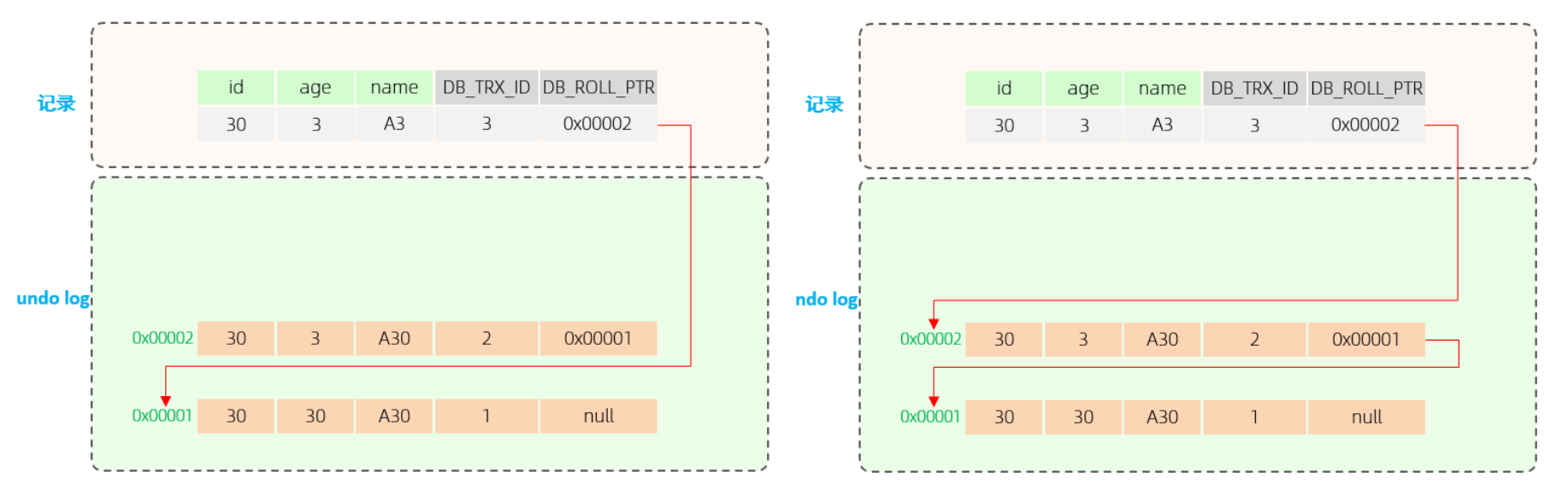 最终发现,不同事务或相同事务对同一条记录进行修改,会导致该记录的undolog生成一条记录版本链表,链表的头部是最新的旧记录,链表尾部是最早的旧记录。