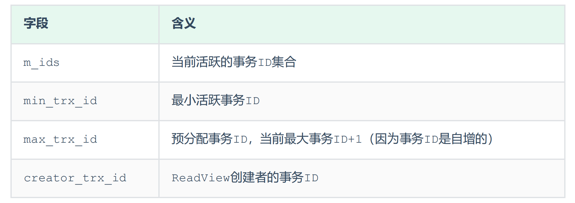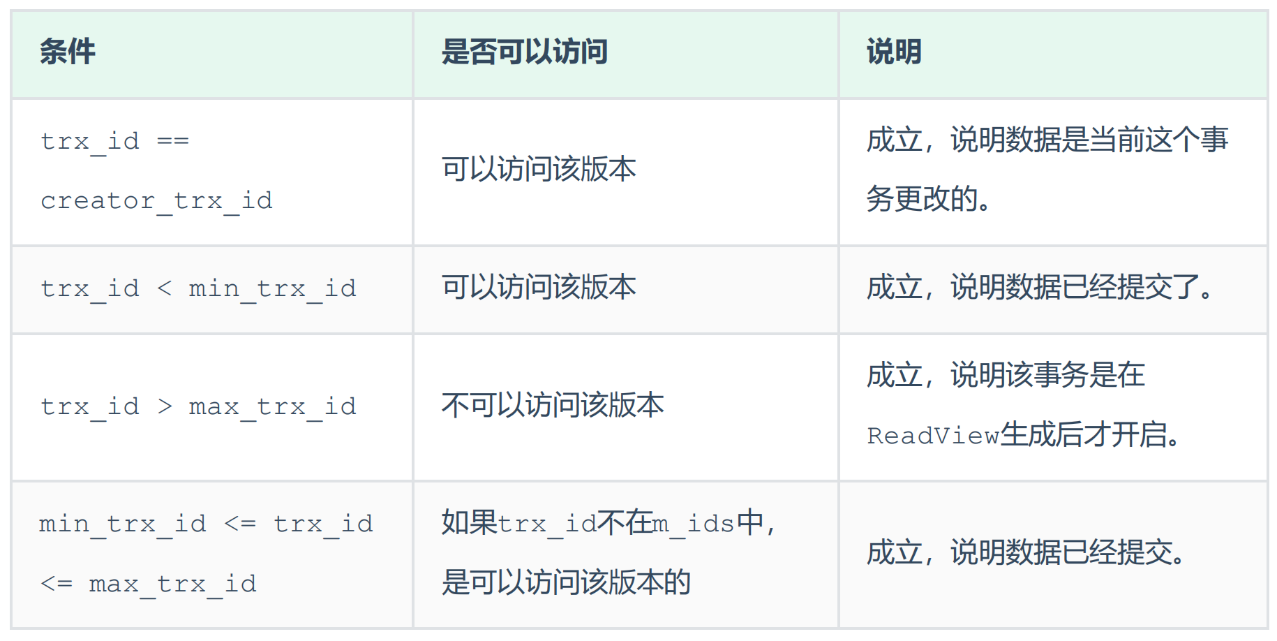 而在readview中就规定了版本链数据的访问规则:trx_id 代表当前undolog版本链对应事务ID。