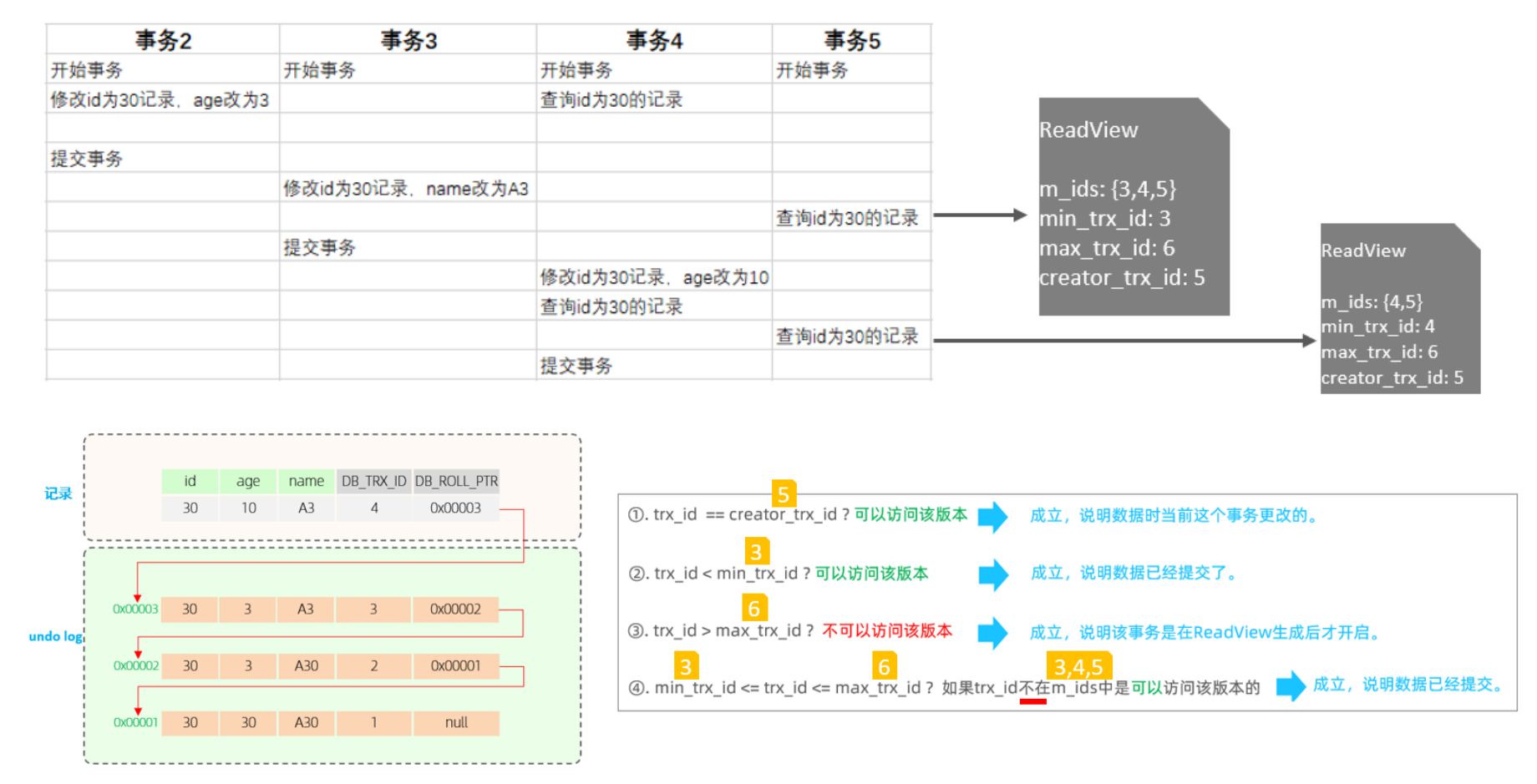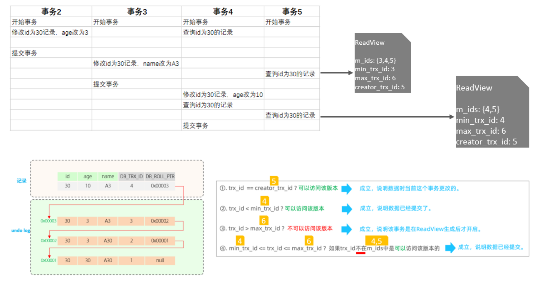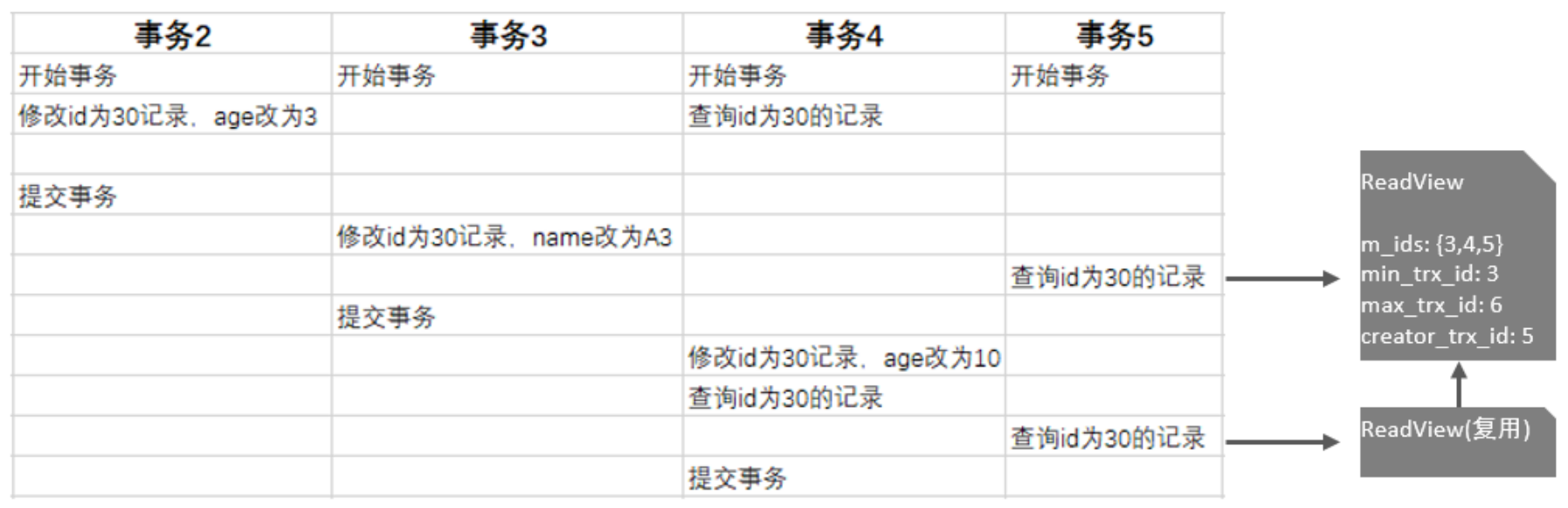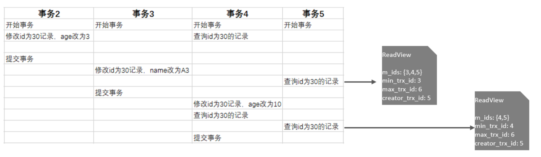 在事务5中,查询了两次id为30的记录,由于隔离级别为Read Committed,所以每一次进行快照读都会生成一个ReadView,那么两次生成的ReadView如下。