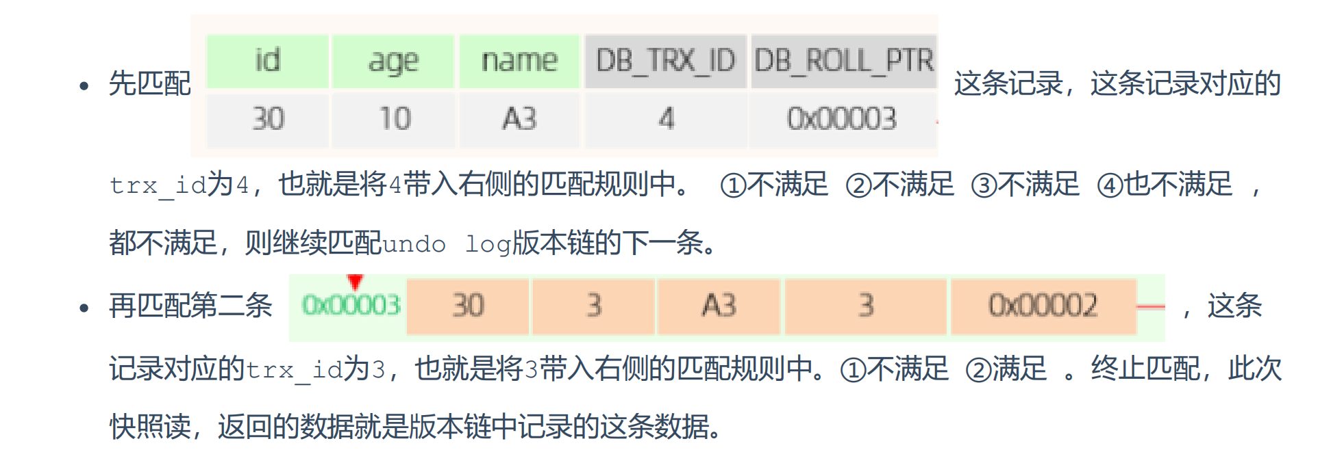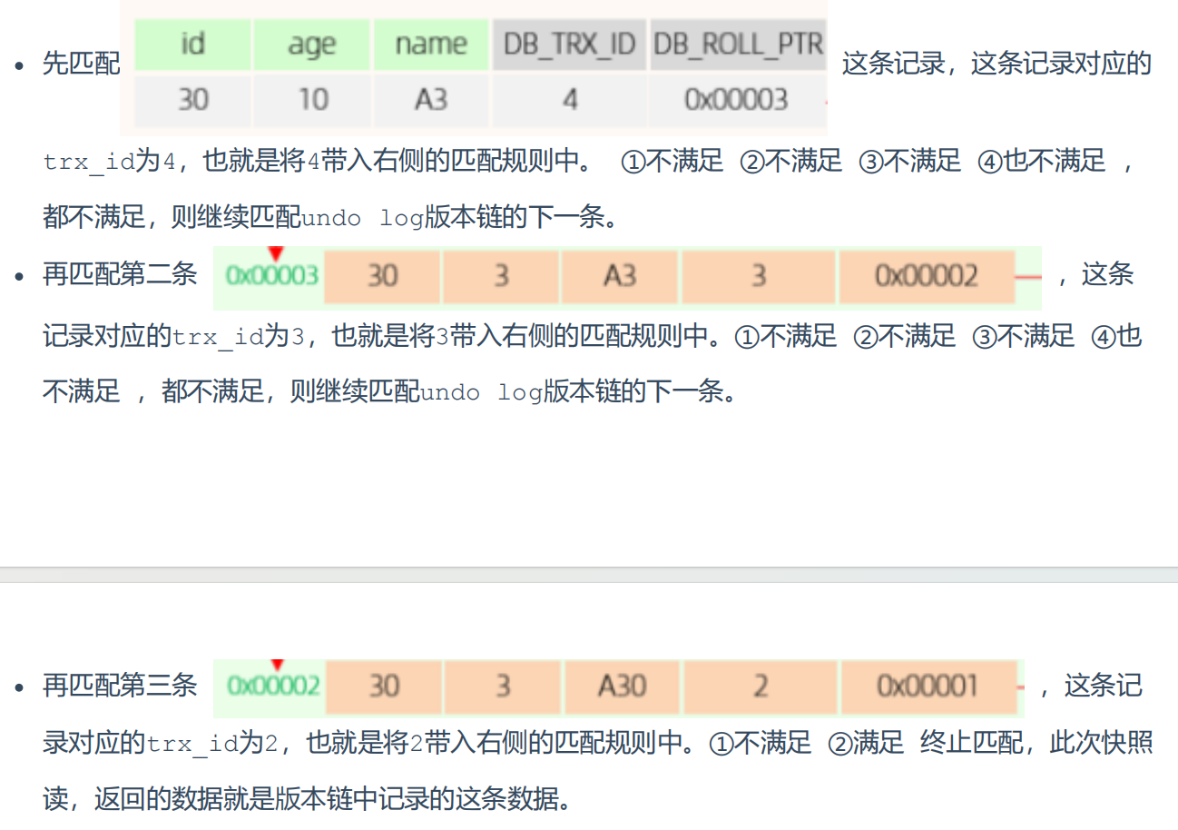 在进行匹配时,会从undo log的版本链,从上到下进行挨个匹配: