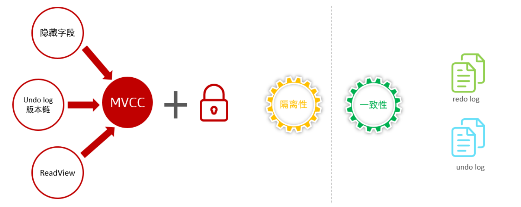 而对于这四大特性,实际上分为两个部分。 其中的原子性、一致性、持久化,实际上是由InnoDB中的两份日志来保证的,一份是redo log日志,一份是undo log日志。 而持久性是通过数据库的锁,加上MVCC来保证的。