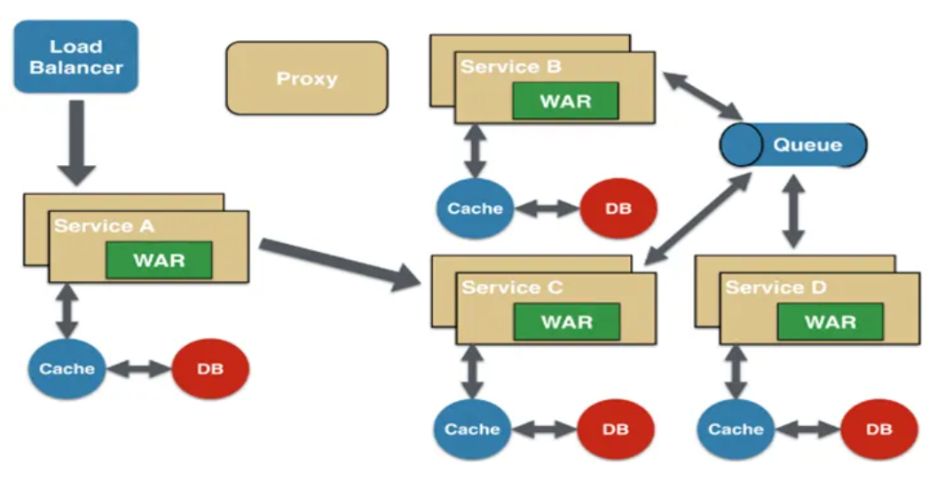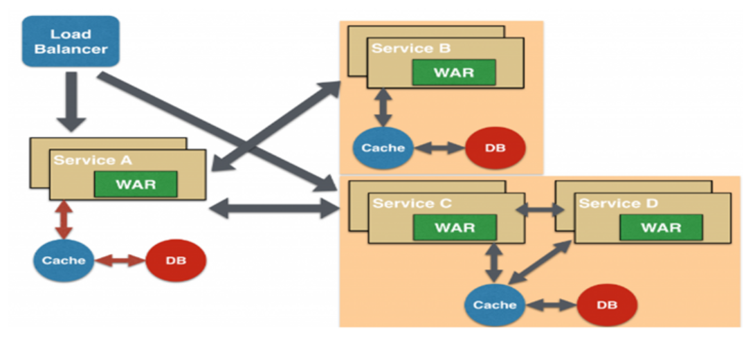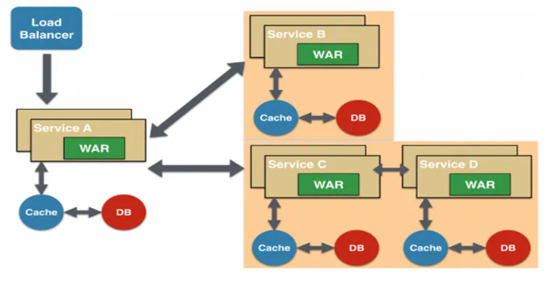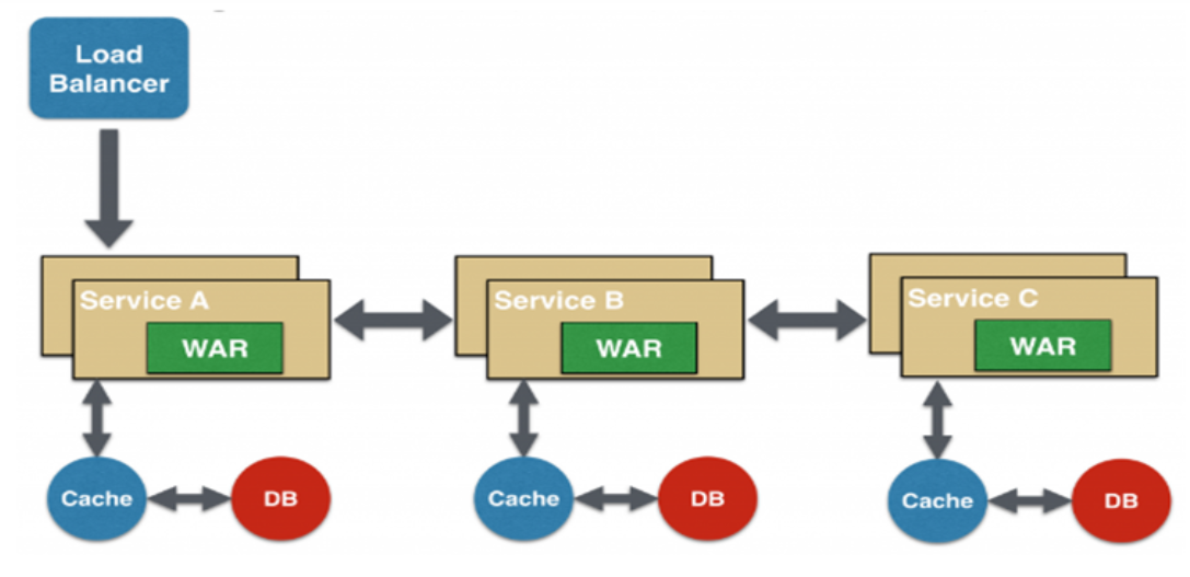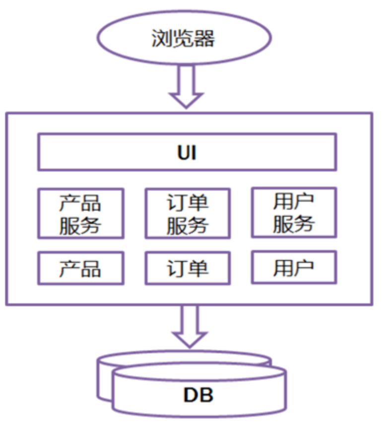 所有的功能打包在一个 WAR包里,基本没有外部依赖(除了容器),部署在一个JEE容器(Tomcat,JBoss,WebLogic)里,包含了 DO/DAO,Service,UI等所有逻辑。