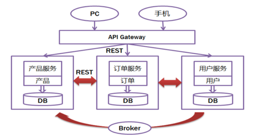 虽然REST设计模式非常流行,但它是同步的,会造成阻塞。因此部分基于微服务的架构可能会选择使用消息队列代替REST请求/响应,如下图所示:
