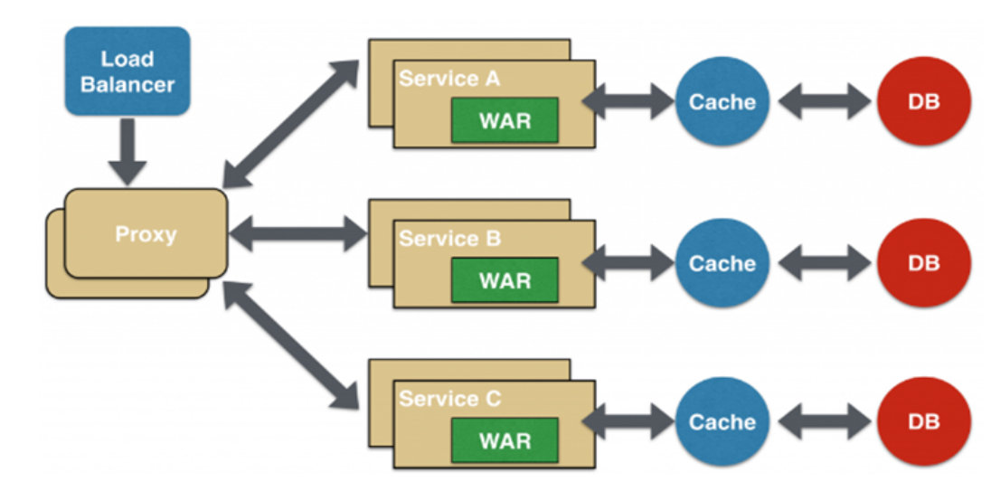 所有的功能打包在一个 WAR包里,基本没有外部依赖(除了容器),部署在一个JEE容器(Tomcat,JBoss,WebLogic)里,包含了 DO/DAO,Service,UI等所有逻辑。