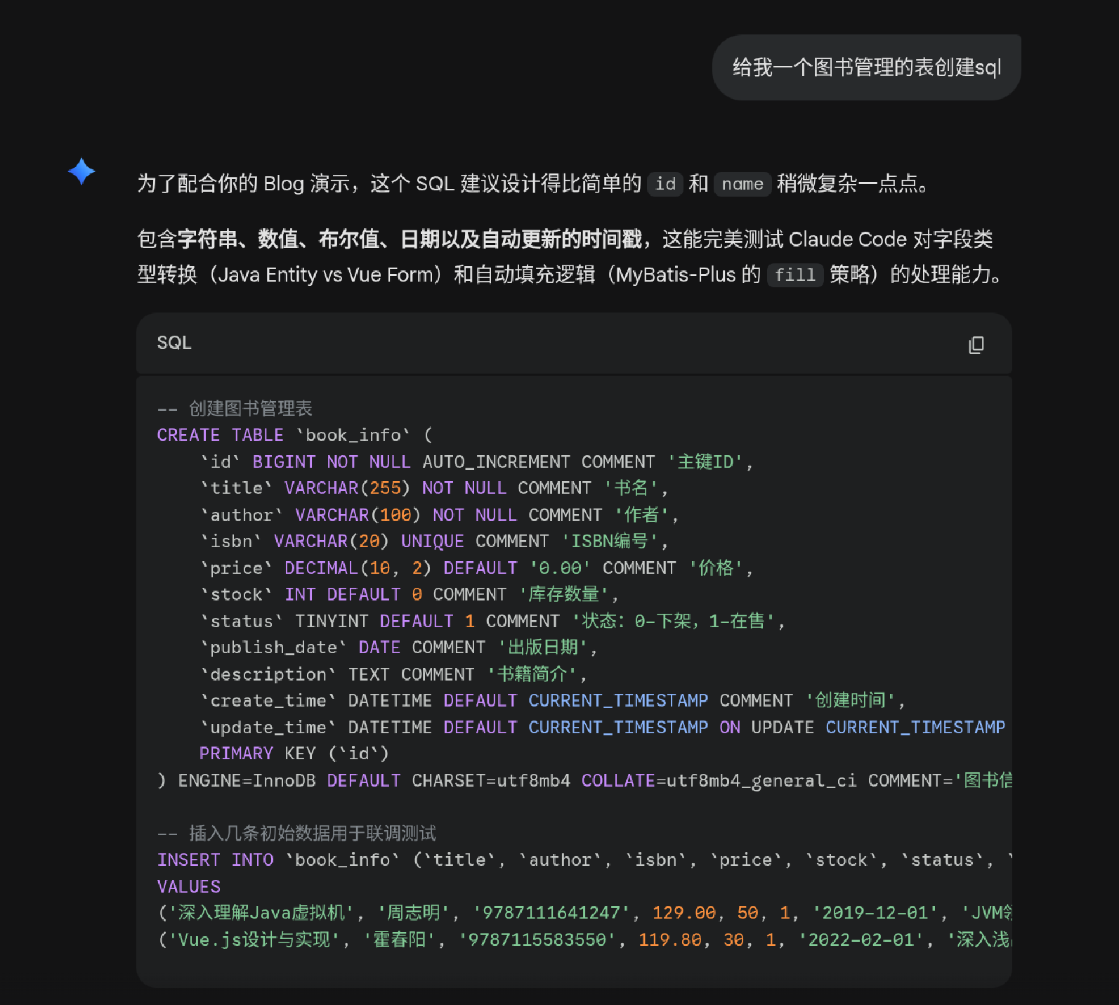 来看看AI时代怎么玩,建表语句我都先不想了,直接让AI给我一个