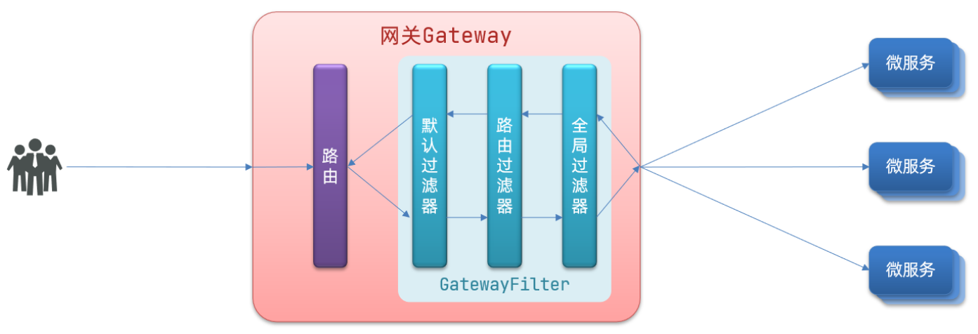 请求进入网关会碰到三类过滤器:当前路由的过滤器、DefaultFilter、GlobalFilter